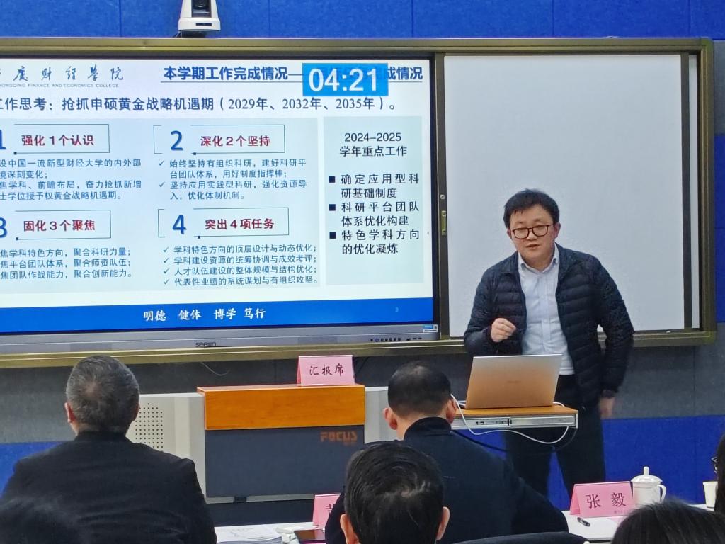 会议伊始,张毅书记对各二级部门的学期工作汇报提出指导性意见。他强调,总结汇报是各部门围绕目标责任书对本学期工作的一次全面梳理,也是一次交流沟通,更是对下一步工作的提前谋划,各部门要赛马比拼亮成绩,激发和提振大家的“精神气”,确保学年度目标任务的全面达成。随后,学校各二级学院、职能部门负责人从学年度目标完成情况、工作亮点、存在的不足及下学期工作打算等方面对本学期部门工作展开全面汇报,通过数据和实例,生动展现了各部门取得的显著成绩和工作亮点。