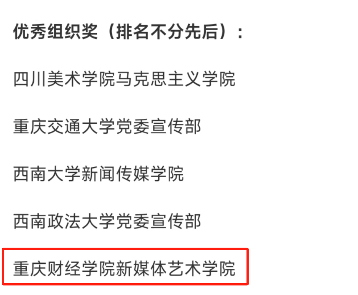 由我校新媒体艺术学院张文博、张红梅老师策划指导,张仁洋、邹柠熠、王艺颖、王艺霖、向梓豪主创的作品《画梦长江生态文明“江”来可期》荣获二等奖;张仁洋、王艺霖、向梓豪主创的作品《且以青春诵红岩》荣获优秀奖。我校新媒体艺术学院获评优秀组织奖,全市共5所高校获评,我校为唯一入选的民办本科院校,且获奖数居全国本科院校前列。