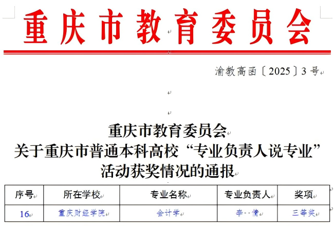 近日,重庆市普通本科高校“专业负责人说专业”活动在重庆科技大学成功举办。学校会计学院会计学专业负责人李倩教授荣获三等奖。