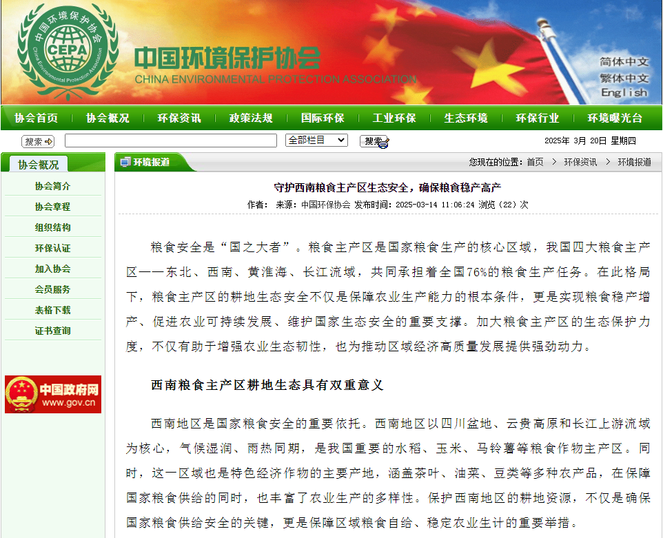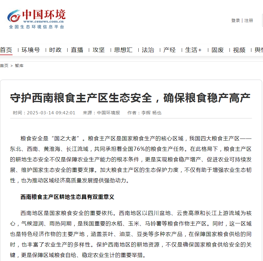 近日,我校公共管理学院李辉教授领衔撰写的《守护西南粮食主产区生态安全,确保粮食稳产高产》理论文章在权威媒体平台引发广泛关注。3月14日,该成果在中国环境报刊发后,迅速被新浪网、中国环境网、中国能源网、碳交易网等主流媒体转载,同步被中国环境保护协会纳入年度重点推荐文献,标志着我校在生态文明领域的研究取得进一步突破性的进展。