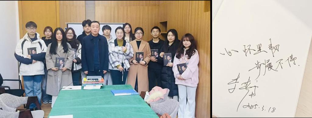 当鎏金书页映亮青春脸庞,“成长盲盒”在期待中绽放惊喜。交流会也迎来尾声,李春雷副校长将亲笔签名的《雷军传》递到班委手中,他殷切寄语:“心怀坚韧,步履不停”,期望同学们从书中汲取力量,在学业与职业路上勇敢突破。这份承载教育深情的礼物,在掌声中化为精神传承的仪式。这场深度对话,是青春热望与师者仁心的双向奔赴,相信2024级土地资源管理一班的学子们,将以此刻为起点,仰望星空、脚踏实地,续写属于他们的青春华章。