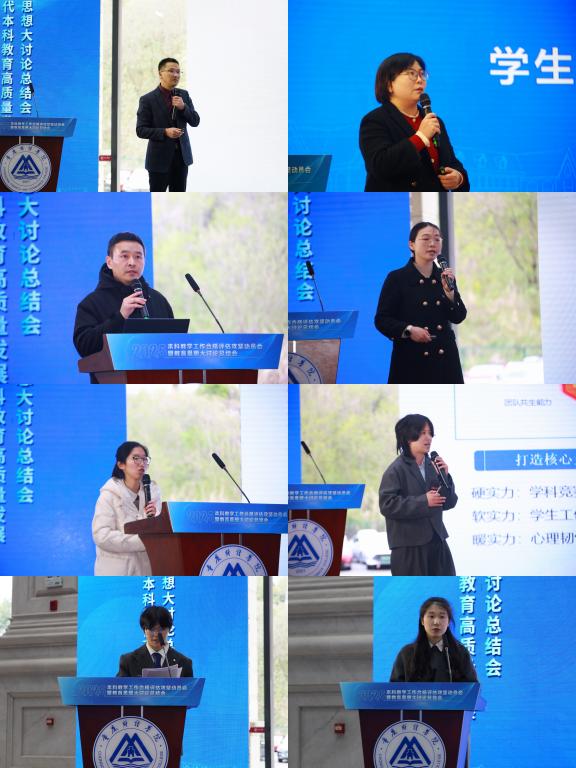 在“六说”环节,来自学校各部门、学院的发言代表,通过多维度分享,全面展示教育思想大讨论的丰硕成果。教务处处长李红平紧扣教学逻辑主线,围绕人才培养体系、教学成果实绩、合格评估现存差距及攻坚举措等方面展开阐述;学生处处长唐川川以需求驱动为导向,提出一套系统的学生成长支持体系创新实践方案;金融学院院长贺晗,立足新时代金融行业发展趋势,就金融人才培养改革路径发表论述;物流工程学院专职教师李淑梅以“一核牵引双链融合”为核心理念,深入探讨高素质应用型物流人才的培养模式;会计学院专职教师谭集丹,分享基于 SQL 的财务分析技术,为财务教学与实践提供新思路;物流工程学院专职辅导员罗贤提出阶梯式班级成长路径,助力学生班级管理模式创新;学生代表姜嘉豪、杨佳怡分别讲述程序员的成长历程以及会计专业学生在教育改革浪潮中角色与认知的转变,从学生视角为学校教育教学改革提供宝贵的反馈。