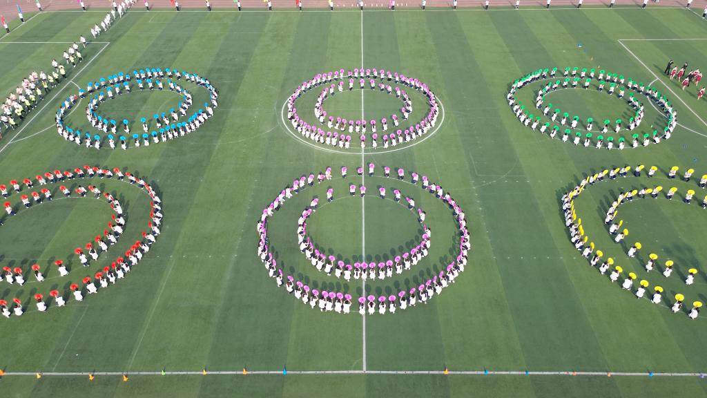 开幕式表演在震天的鼓声中拉开帷幕。500名学生组成的梆鼓方阵以雷霆之势登场,他们身着统一服装,手持红绸鼓槌,在运动场上整齐列阵。铿锵有力的鼓点,搭配着学生们矫健的身姿和不断变换的队形,将传统民间艺术与现代团体操完美融合,瞬间点燃了全场观众的热情。
