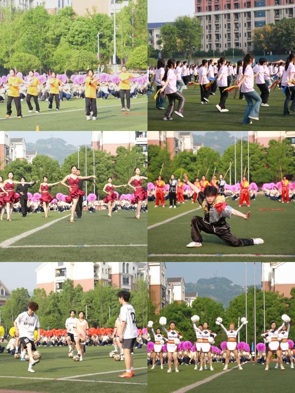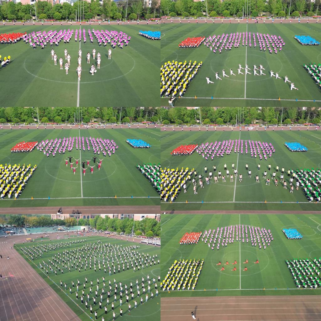随后,600名学生联袂献上以“承古拓新 智慧未来”为主题的大型团体操表演。其中,序章“智慧启航”,他们手持彩扇,通过队形变换展现学校发展蓝图;第一章“承古朔魂”,武术与柔力球表演刚柔并济, 彰显中华文化的深厚底蕴;第二章“融汇新风”,匹克球与体育舞蹈活力四射,迸发出青春活力;第三章“竞速超越”,足球与健美操动感十足,诠释了体育竞技的激情与魅力;第四章“跃动未来”,啦啦操与集体舞表演中,呈现出“强国、健体、数字、创新”造型,既展现了重财学子昂扬向上的精神风貌,更寄托了全校师生对美好未来的无限憧憬。整场表演气势恢宏、创意十足,赢得了阵阵喝彩。