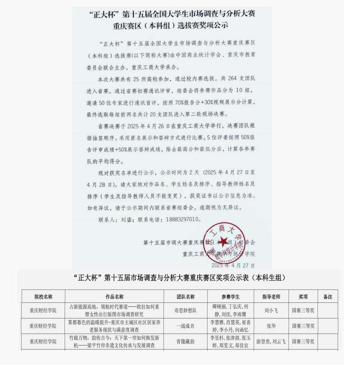 近日,由中国商业统计学会主办的“正大杯”第十五届全国大学生市场调查与分析大赛本科组重庆赛区选拔赛圆满落幕。我校参赛队伍荣获全国三等奖3项、重庆市级一等奖5项、市级二等奖2项和市级三等奖5项。