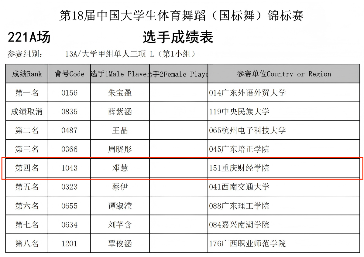 作为全国高校体育舞蹈的顶级赛事,该比赛吸引了来自全国176所高校共计1700余名运动员参加。在为期4天的团体和单项激烈竞赛中,队员们团结协作、奋勇拼搏、斗志昂扬、沉着应战、积极进取,纷纷闯入半决赛和决赛圈。其中唐钰琳同学获得大学甲组单人单项R第四名,邓慧同学获得大学甲组单人三项L第四名,这次是我校单人成绩的历史最好成绩,首次突破全国前五。
