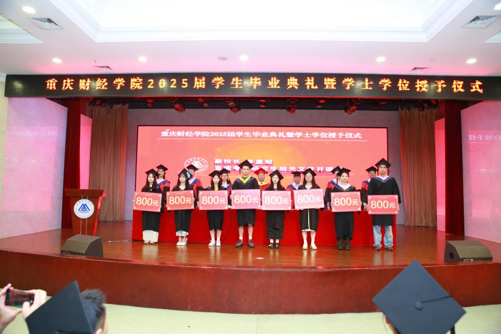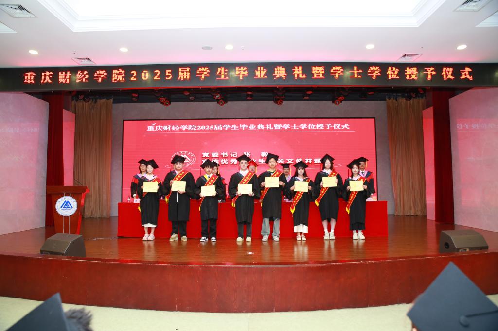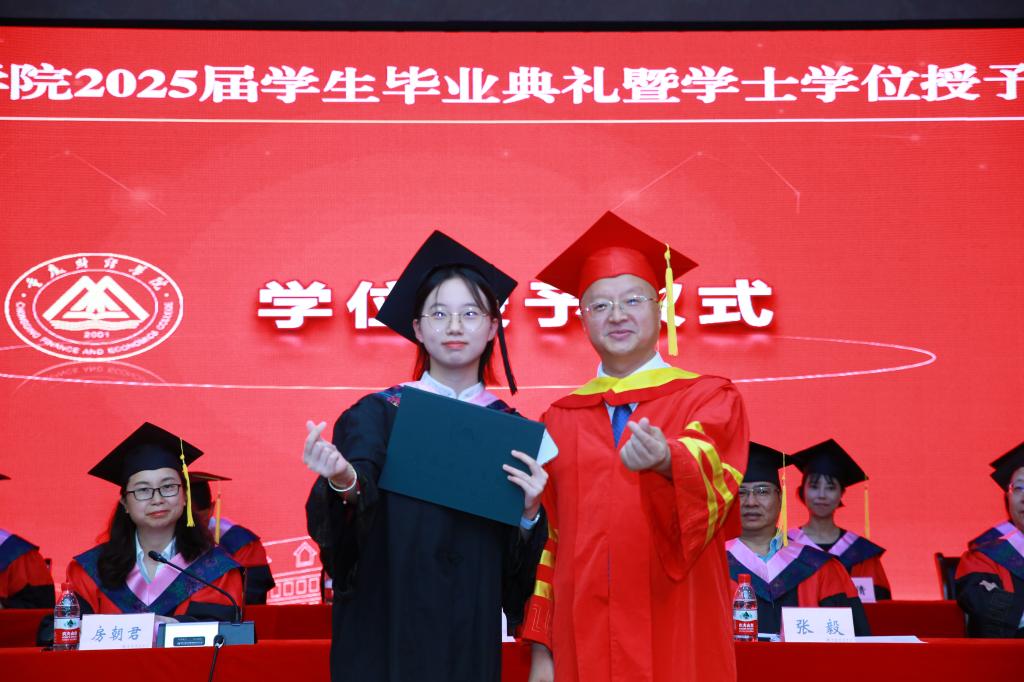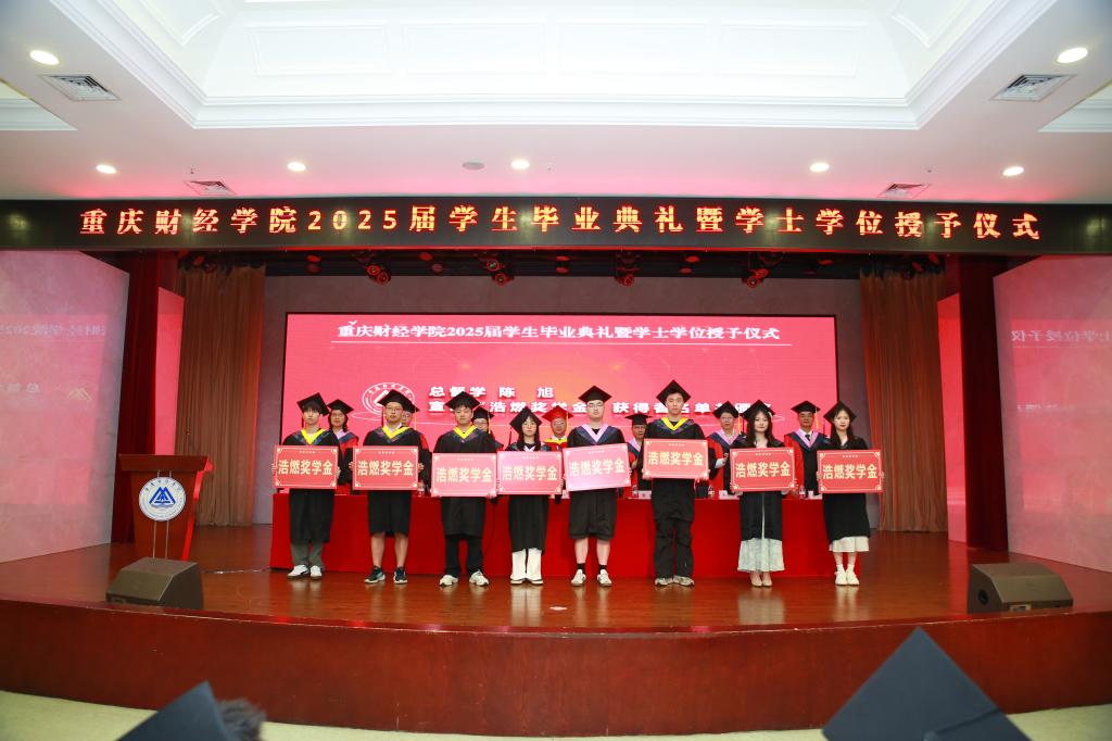 毕业典礼上,张毅宣读《关于表彰2025届校级优秀毕业生的决定》、李嘉明宣读《关于对谭诗燕等178名考取硕士研究生的2025届毕业生予以奖励的决定》、崔中山宣读《关于准予2025届4695名学生毕业的决定》和《关于授予2025届4680名毕业生学士学位的决定》、陈旭宣读《关于表彰2025年浩燃奖学金获得者的决定》,台上校领导依次为获奖毕业生颁奖。
