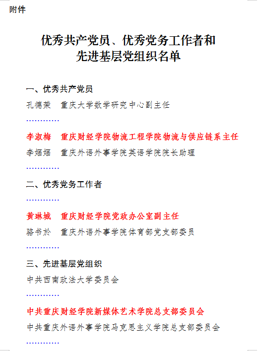630日,在庆祝中国共产党成立104周年之际重庆市委教育工委下发了《关于表彰优秀共产党员、优秀党务工作者和先进基层党组织的决定》,其中我校物流工程学院李淑梅同志获评优秀共产党员、党政办公室主任黄琳城同志获评优秀党务工作者、新媒体艺术学院党总支获评先进基层党组织。