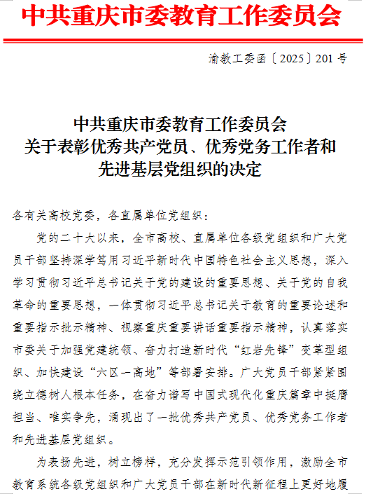 学校在重庆市教育系统“两优一先”评选中喜获佳绩