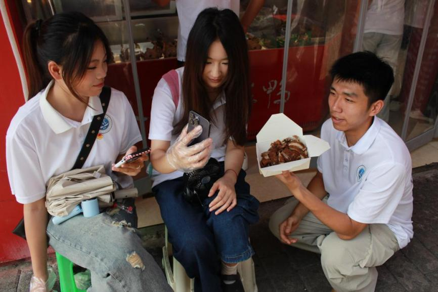 同一时间,未前往栋青村的实践团成员正在油酥鸭的生产间,见证木洞百年非遗美食油酥鸭的“诞生”过程。随后志愿者们拿起手机,围绕油酥鸭展开介绍,用专业知识带直播间的观众走近特色美食的背后故事。