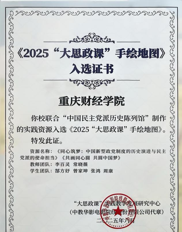 在李百灵、陈开江、常晓薇等教师团队的系统指导下,郜方妤、曾家坤、张鸿、周康等4名学生以影像创作深化实践体验,创作了教学资源类作品《共画同心圆,共圆中国梦》,通过实地讲解、情景再现等形式系统诠释中国新型政党制度的优越性;学生实践资源类作品则以学生视角为主,在教师全程指导下聚焦调研过程中的观察与感悟,真实呈现青年在实践中的历史思考与成长收获,其中由邹枝利创作的手绘地图,作为学生实践成果类作品的一部分,细致勾勒出多党合作的历史脉络与精神内涵。这两类作品从不同维度将历史文献转化为可感可知的思政素材,形成了“教学+实践+数字”的育人闭环。