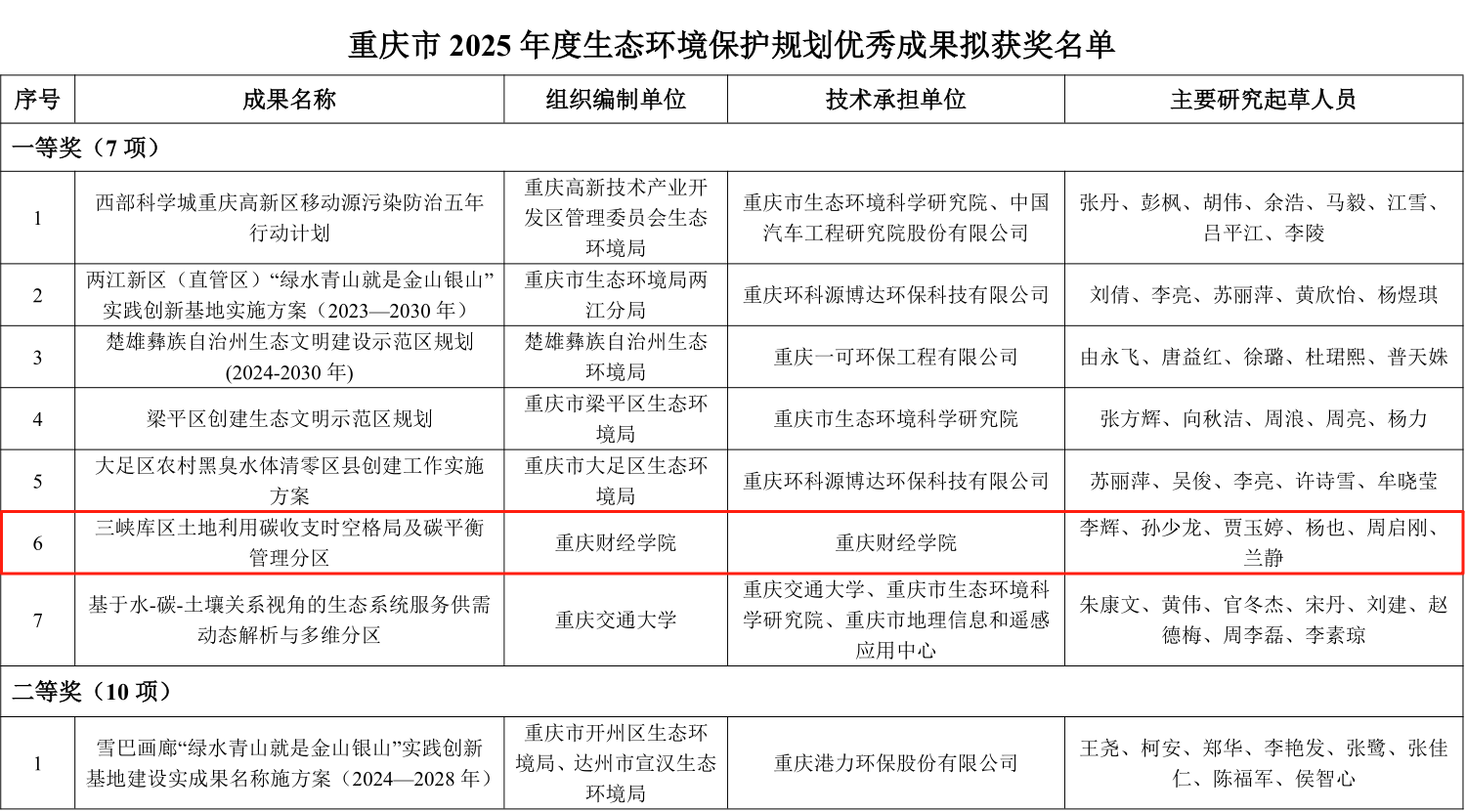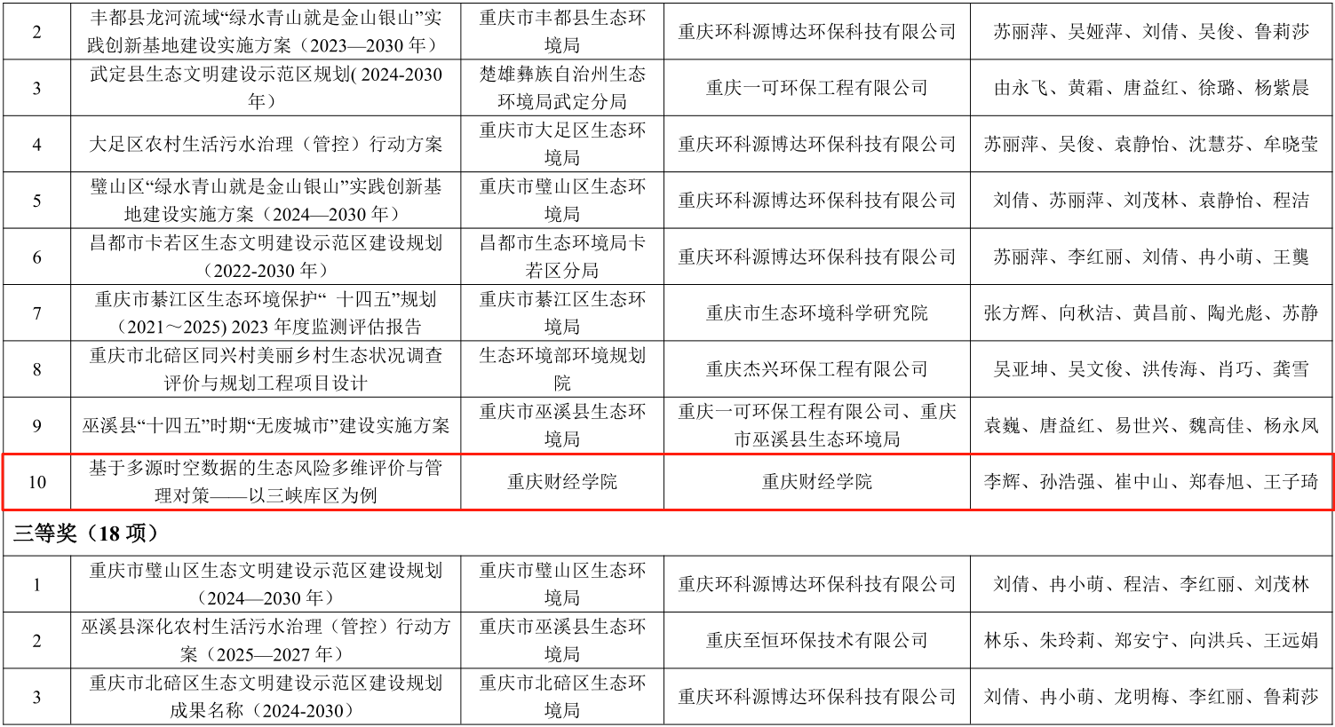 近日,重庆市环境科学学会公布了2025年度生态环境保护规划优秀成果评选结果。我校在此次评选中表现突出,共获得三项大奖,成为全市唯一一所同时斩获三项奖项的高校。