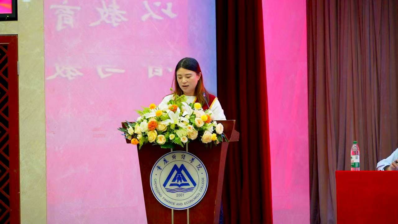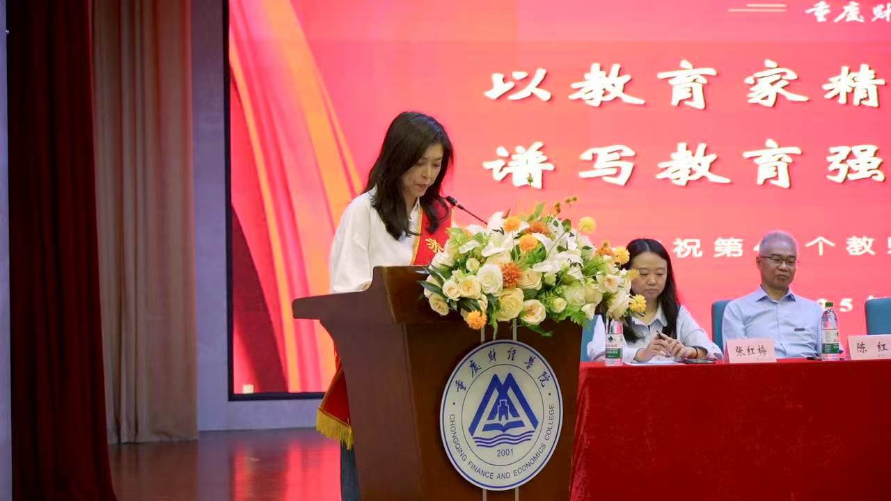 随后,由学生代表为老师们献上了节日祝福的鲜花,祝各位老师节日快乐。学生代表李航同学致感谢辞,表达对老师们感谢的同时,展现了新时代重财学子”向阳而生”“强国有我”的当代风貌。优秀教师代表王莉莉、优秀辅导员代表杨秋菊、优秀教育工作者代表刘艳娇、“赤诚员工”代表罗婷婷则先后从不同角度分享了自己作为教师的成长和体会,并激励全体教师发扬“重财精神”赓续前行。