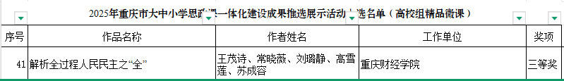 其中,马克思主义学院教师王茂诗、常晓薇、刘璐静、高雪莲、苏成容团队制作的《解析全过程人民民主之“全”》荣获高校组精品微课三等奖。