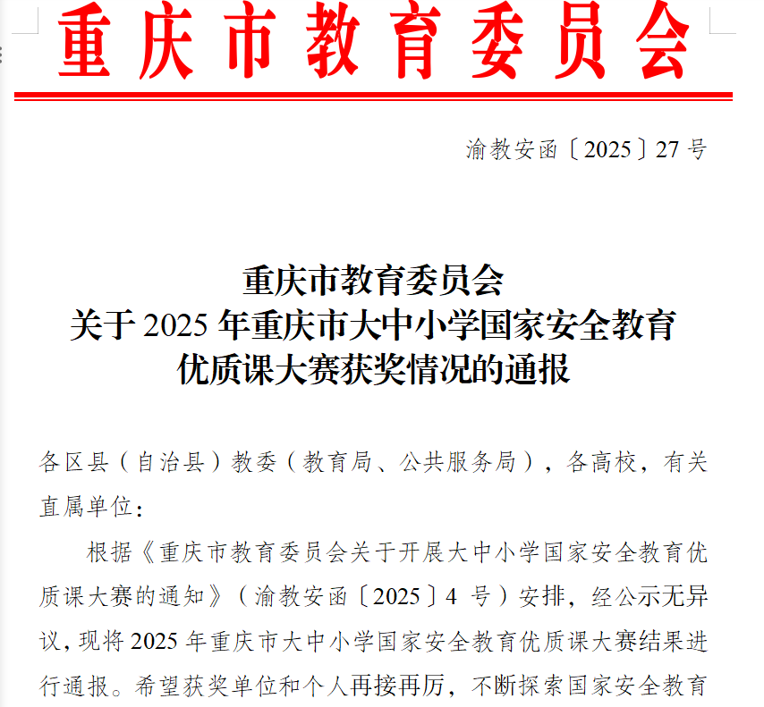 今年上半年,重庆市教委先后举办了大中小学国家安全教育优质课大赛及思政课一体化建设成果推选活动。近日,两项活动评选结果在重庆市教委发布的渝教安函〔2025〕27号和渝教工委函〔2025〕212号文件中予以公布,我校均荣获佳绩,充分彰显了我校在大中小学思想政治教育一体化建设中的综合实力与育人成效。