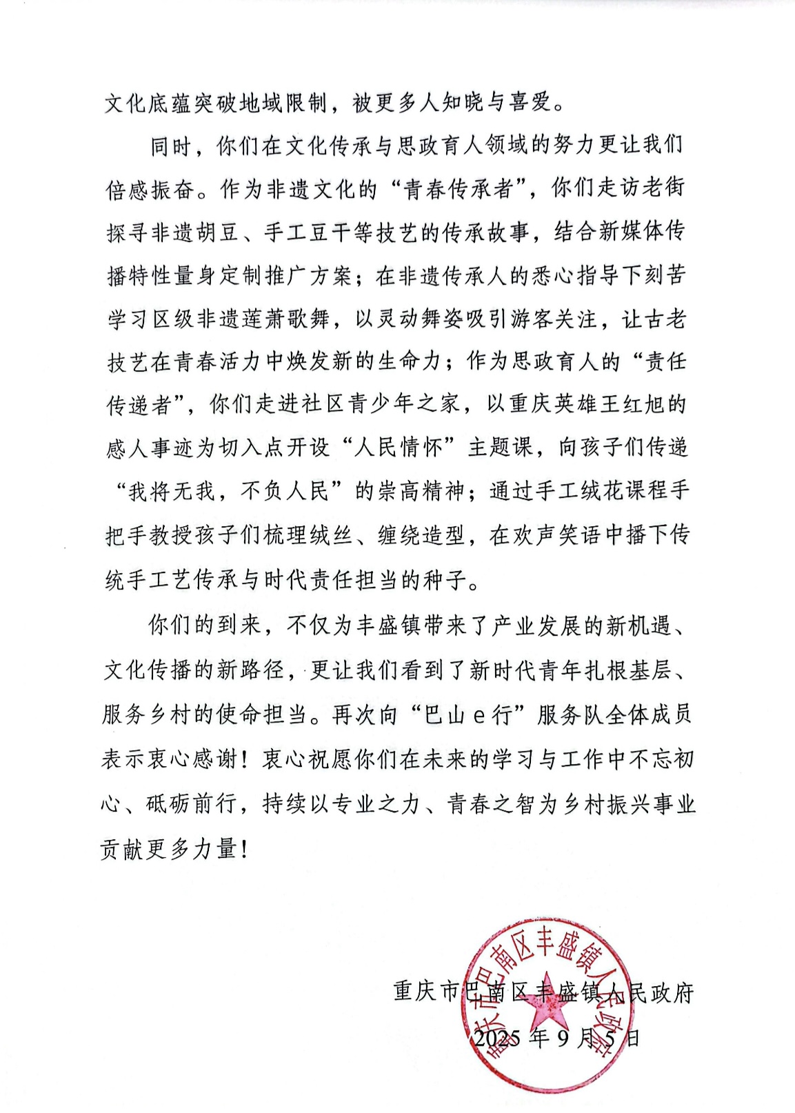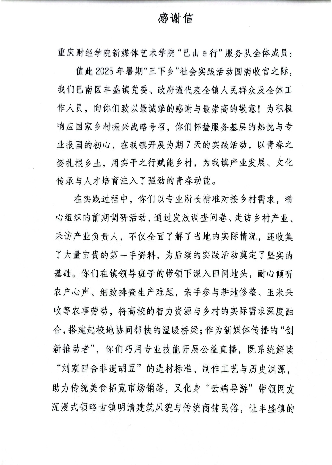 近日,我校新媒体艺术学院收到来自重庆市巴南区丰盛镇人民政府的感谢信,对学院2025年暑期“三下乡”社会实践团队“巴山e行”服务队的突出贡献给予高度评价。信中充分肯定了团队在助力乡村振兴、非遗传承和思政育人等方面取得的显著成效,彰显了重财学子扎根基层、服务社会的青春担当。