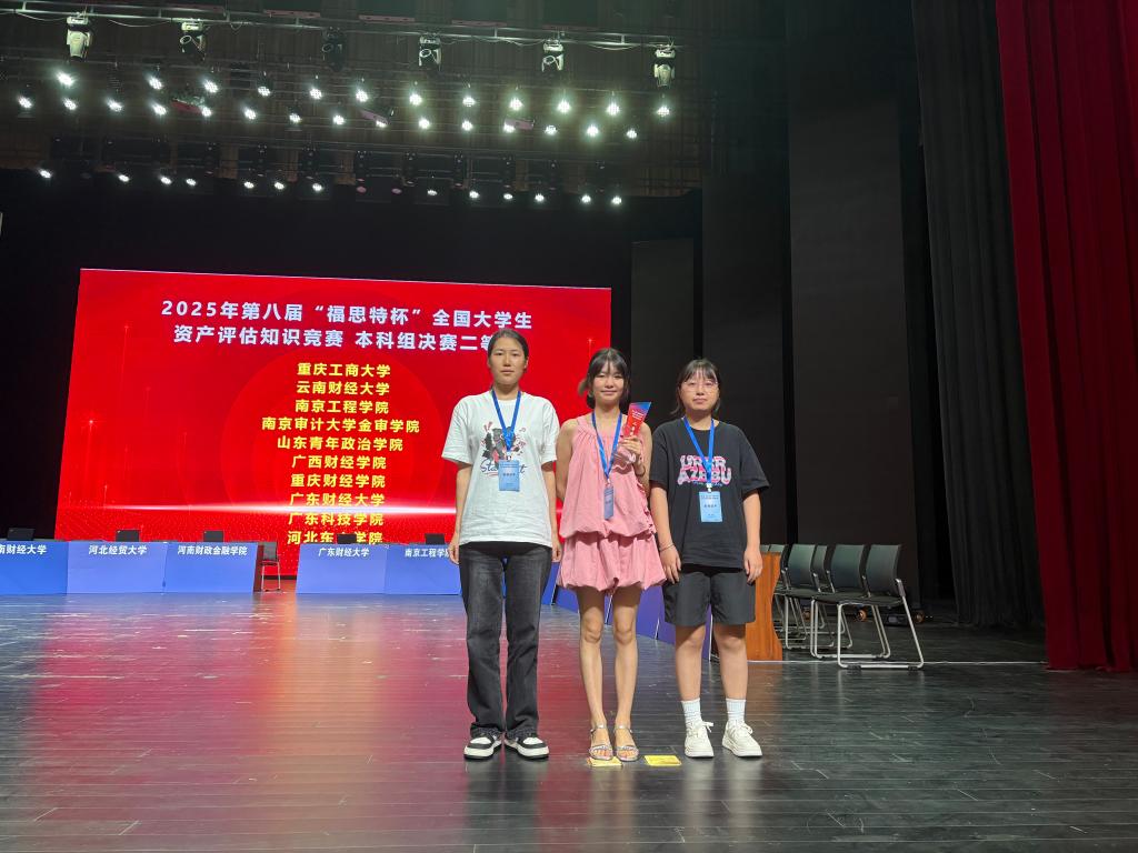 2025年9月13日,由全国资产评估高等教育实验教学研究会主办、重庆工商大学承办的第八届“福思特杯”全国大学生资产评估知识竞赛圆满落幕。由我校会计学院杨洋、胡婷婷老师带队,资产评估专业学生刘忠平、杜月泓、石庆月组成的参赛团队表现出色,荣获全国二等奖。