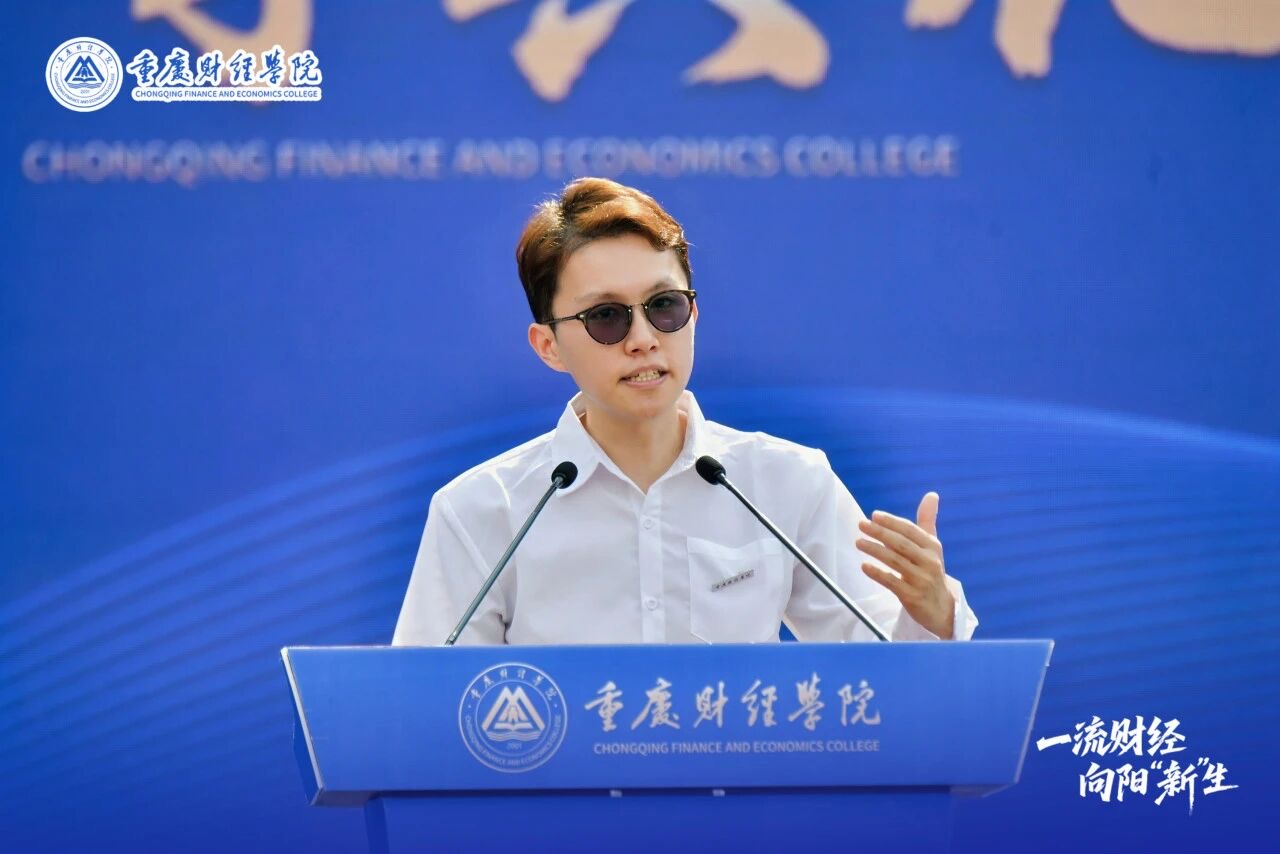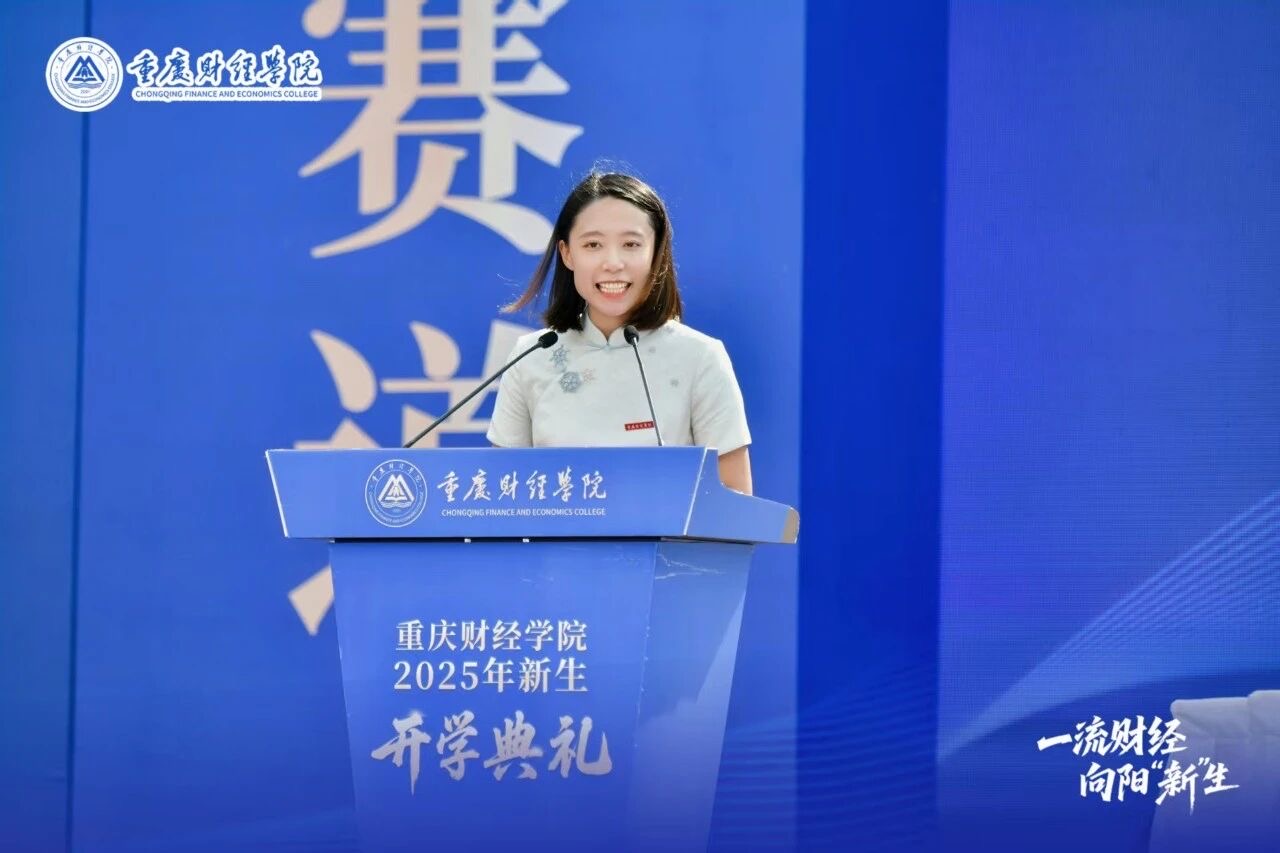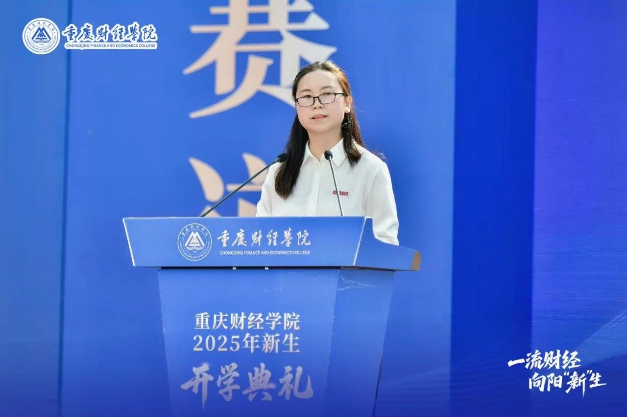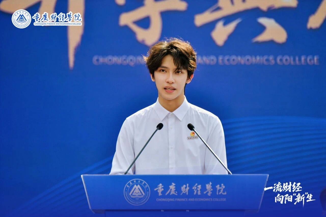 新生代表新媒体艺术学院2025级播音主持与艺术专业的何腾荣在发言中向学校、师长和亲友表达衷心感谢。他表示将牢记嘱托、坚定自信、求精求实、奋发有为,在青春的赛道上全力奔跑、实现“人人出彩”,共同书写与重财人昂扬向上的崭新篇章。