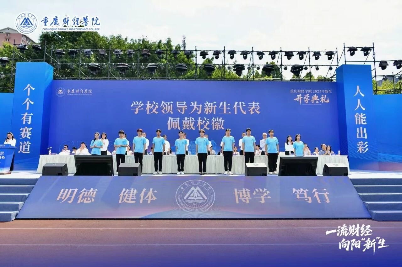 现场举行集体佩戴校徽仪式,学校理事长及校领导为新生代表佩戴校徽,台下新生同步起立自行佩戴,金属校徽熠熠生辉,定格下新生正式成为“重财人”的专属时刻。