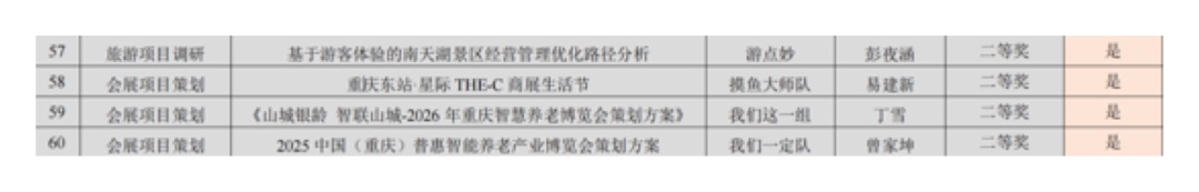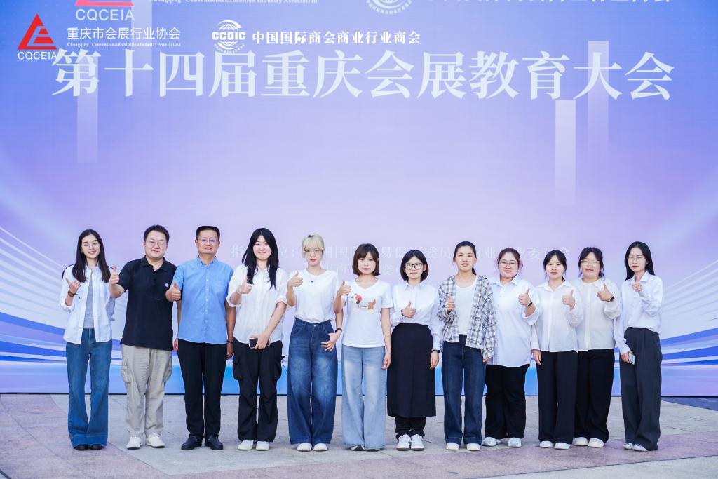 在第十四届重庆高校会展技能大赛中,会务组精准完成会议摆台,展现专业服务素养,获特等奖1项、一等奖1项、二等奖1项;设计组学子融合新媒体艺术,打造完整 VI 设计方案,获特等奖1项、三等奖2项;策划组学子通过方案陈述与答辩,彰显扎实策划能力,获二等奖1项、三等奖3项。
