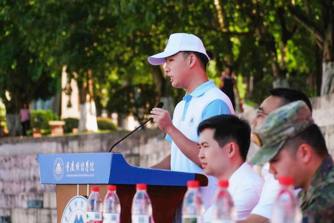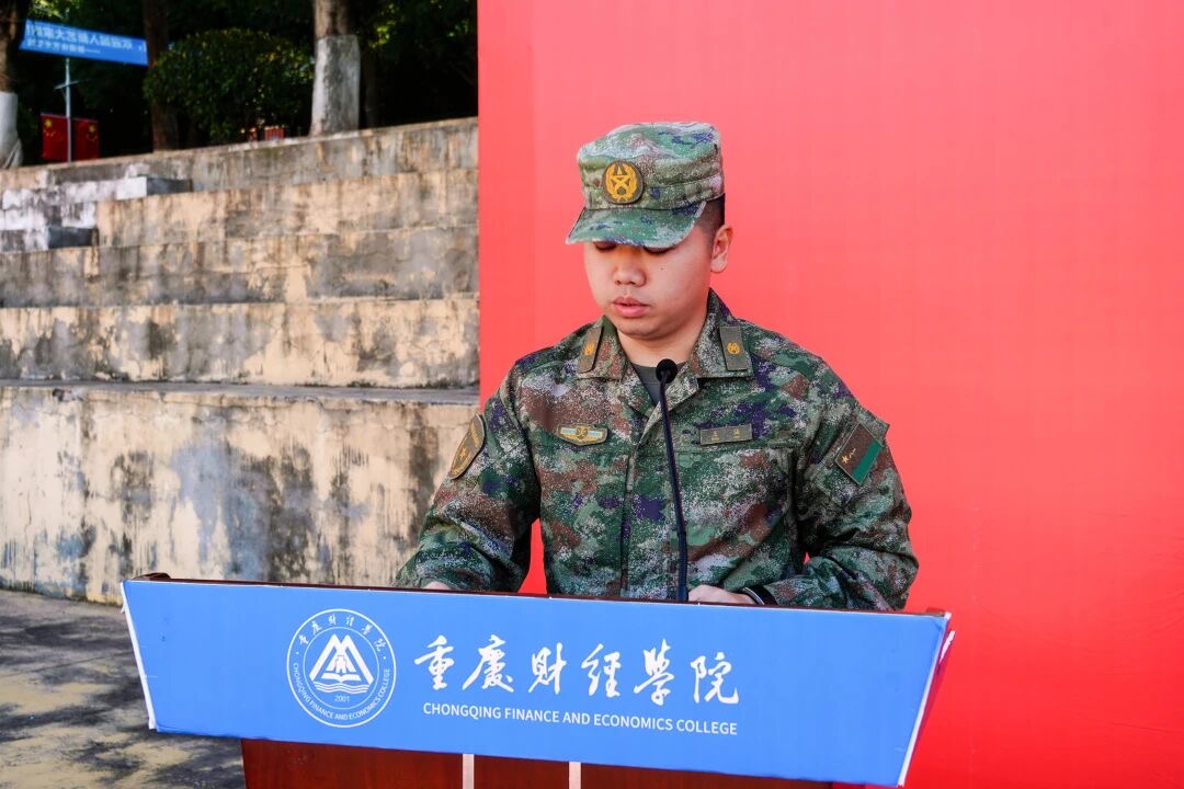 参训学生代表发言环节,经济学院2025级数字经济一班李思道身着整齐军训服,代表全体新生发言。他在发言中表达了对军训生活的期待,展现出对军训生活坚定的决心,号召全体25级新生以青春之姿展现2025级重财学子的昂扬风貌,不负学校与师长的期望。