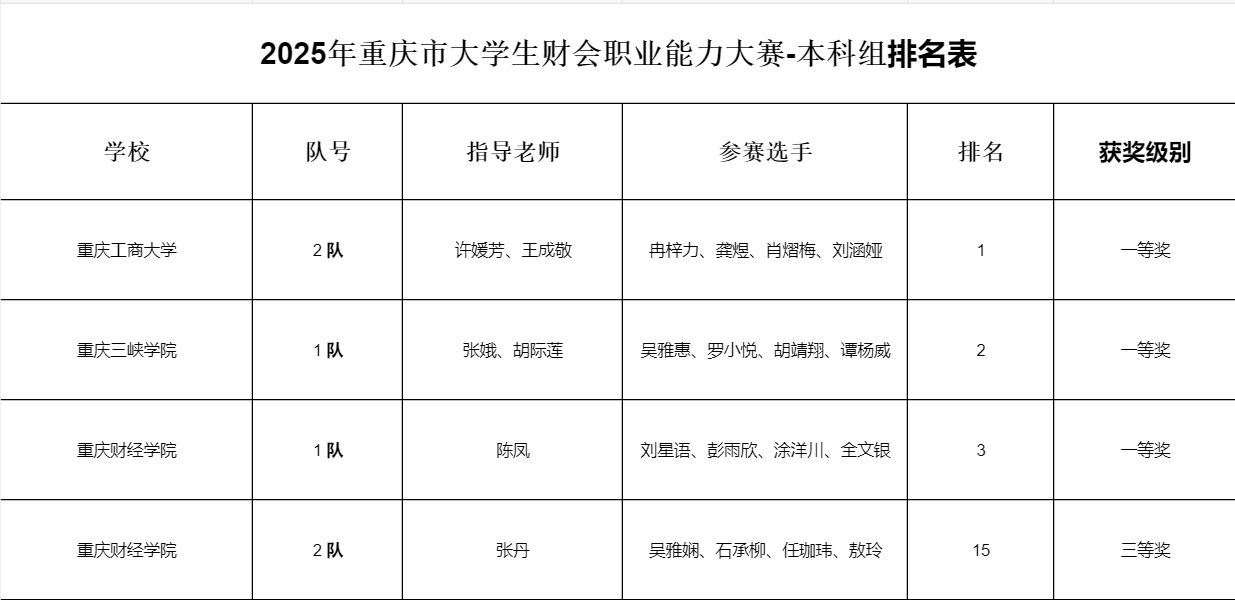 捷报!在近日落幕的2025年重庆市“科云杯”大学生财会职业能力大赛(本科组)中,靠谱的电子游戏官网代表队从包括西南大学、西南政法大学等多所高校的激烈竞争中脱颖而出,实现历史性突破。本次大赛吸引了全市30余所高校的60余支队伍同台竞技。其中,由陈凤副教授指导的1队(刘星语、彭雨欣、涂洋川、全文银)荣获一等奖(总排名第3),由张丹老师指导的2队(吴雅娴、石承柳、任珈玮、敖玲)荣获三等奖(总排名第15)。这一成绩实现了我校在该项赛事中近五年来的奖项“零突破”,标志着我校财会类专业学科竞赛水平迈上新台阶。