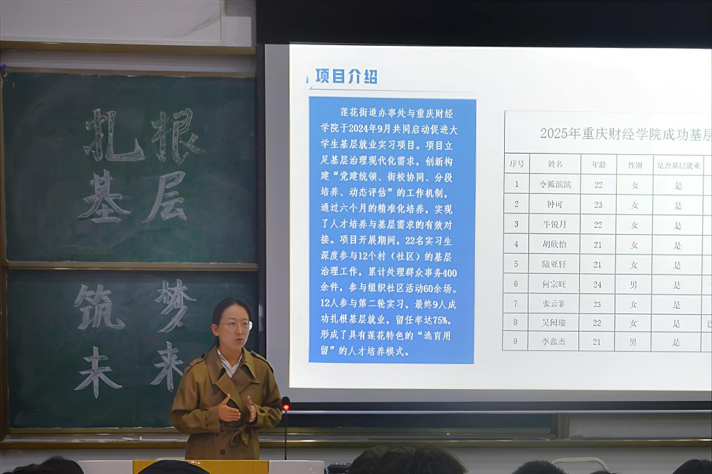 在经验分享环节,五位2025届基层就业优秀学生代表依次发言。他们结合工作实例,生动还原了基层实践中的角色定位与能力成长:从“政策宣传员”的政策解读技巧,到“民情联络员”的群众沟通艺术,再到“服务代办员”的应急事务处理经验,全面展现了基层工作对综合素养的锤炼价值。