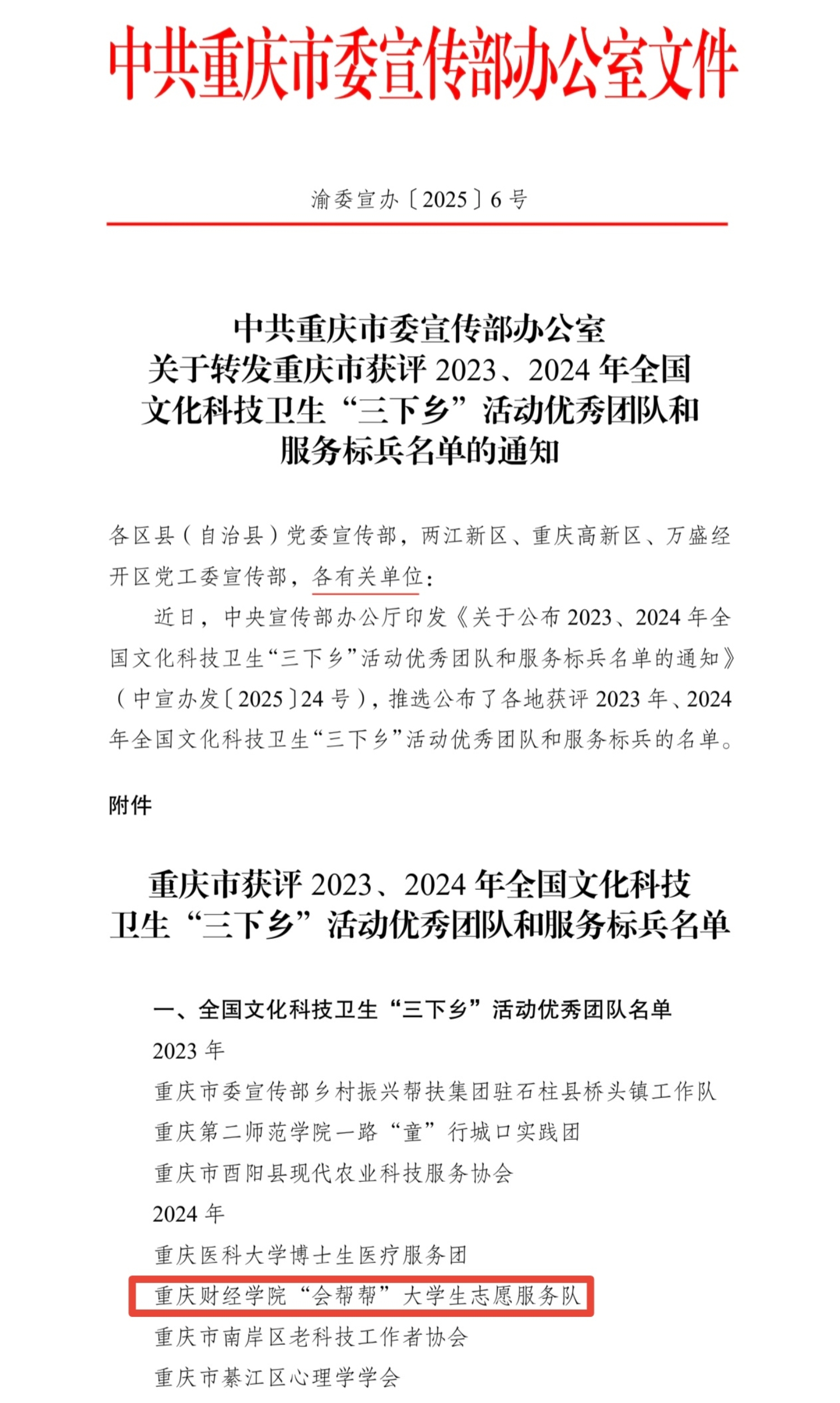近日,中央宣传部办公厅印发了《关于公布2023、2024年全国文化科技卫生“三下乡”活动优秀团队和服务标兵名单的通知》。在2024年度的评选结果中,重庆市共4个团队获评优秀团队称号,我校“会帮帮”大学生志愿服务队成功入选,系该年度重庆市高校唯一获此殊荣的本科生团队。