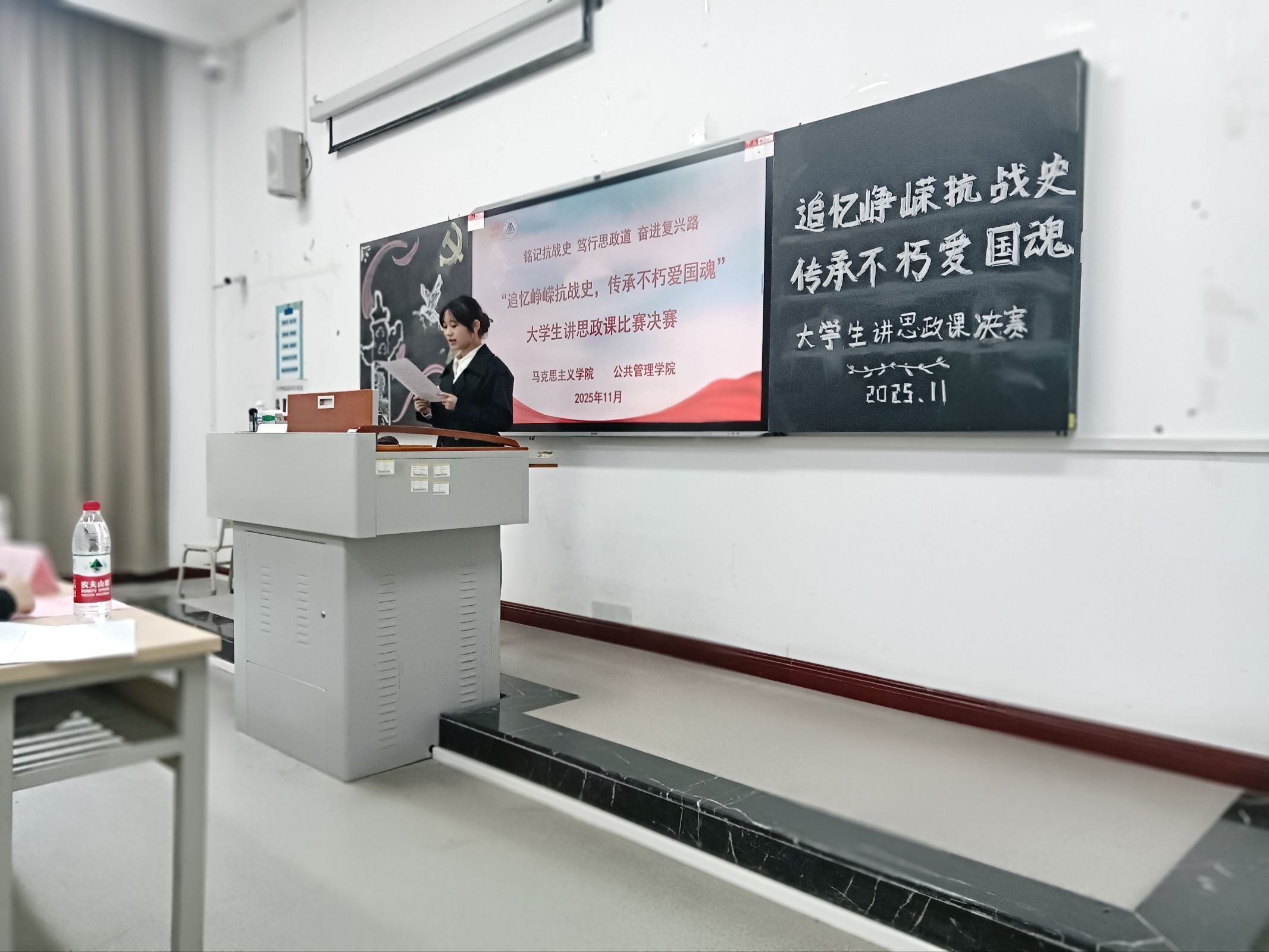 为深入学习贯彻习近平新时代中国特色社会主义思想,落实立德树人根本任务,充分发挥思想政治理论课在大学生思想政治教育中的主渠道作用,厚植青年爱国情怀,引导青年铭记抗战历史、传承红色基因,我校第十三届“大思政课”铸魂育人系列活动之“追忆抗战峥嵘史,传承不朽爱国魂”大学生讲思政课比赛历经初赛、复赛的层层选拔,于2025年11月10日圆满完成决赛阶段比拼。