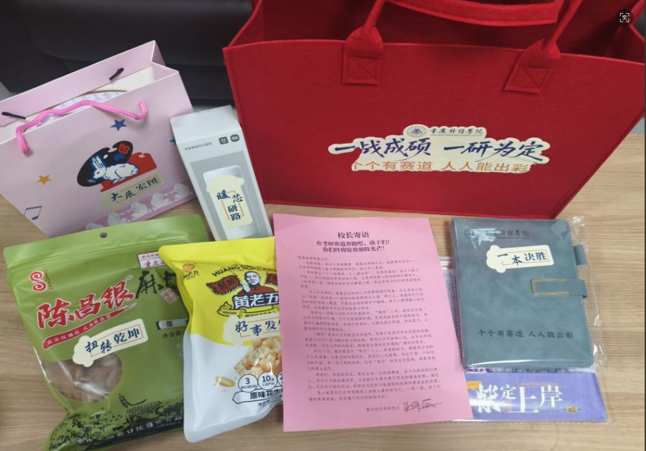 这份礼包是学校调研学子需求后的匠心之作,既实用又寓意深长。其中不仅有适配考试的专用文具套装,更藏着一连串“祝福密码”:象征“好事发生”的花生酥、守护“暖芯研路”的保温杯、承载“一本决胜”的定制笔记本、寄托“大展宏图”的大白兔奶糖、暗含“扭转乾坤”的麻花,每样物品都藏着母校的用心。尤为珍贵的是吴华安校长的亲笔寄语卡片:“衷心祝愿你们在考研赛道上奔跑出最好的自己,一笔一画,写下无悔的青春答卷,绽放属于你们的独特光彩!”