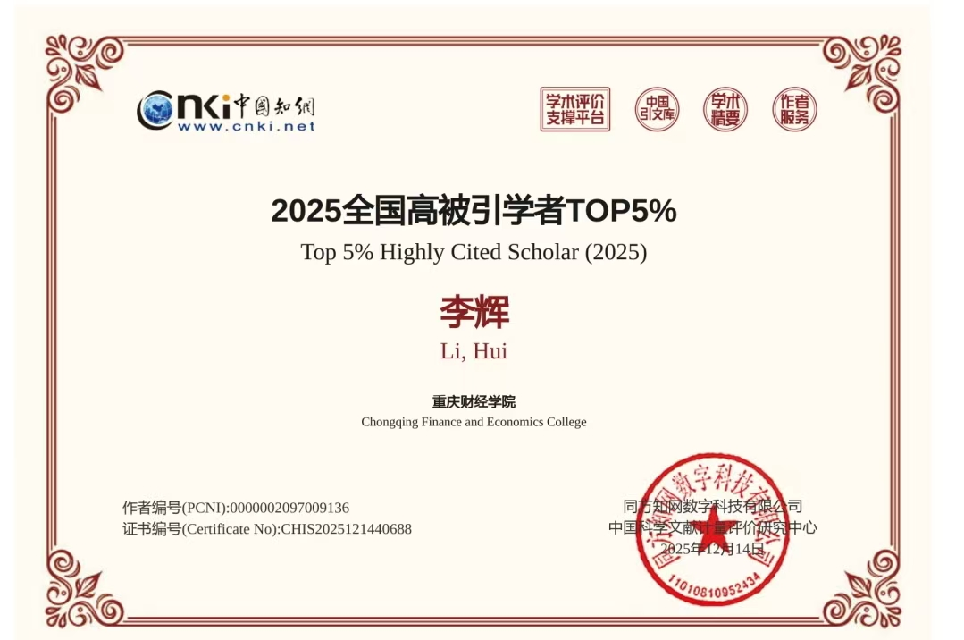 近日,中国知网(CNKI)中国科学文献计量评价研究中心正式发布2025年度“全国高被引学者”榜单。我校公共管理学院李辉教授凭借其长期的学术深耕与广泛的学科影响力,成功入选TOP5%。据了解,李辉教授是我校自有师资队伍中唯一入选的教师,也是迄今重庆民办本科自有师资中唯一获此殊荣的教师。这是其继2024年后再次获此殊荣,不仅标志着其个人学术影响力的持续攀升,也是我校学科建设与科研创新实力稳步提升的生动体现。