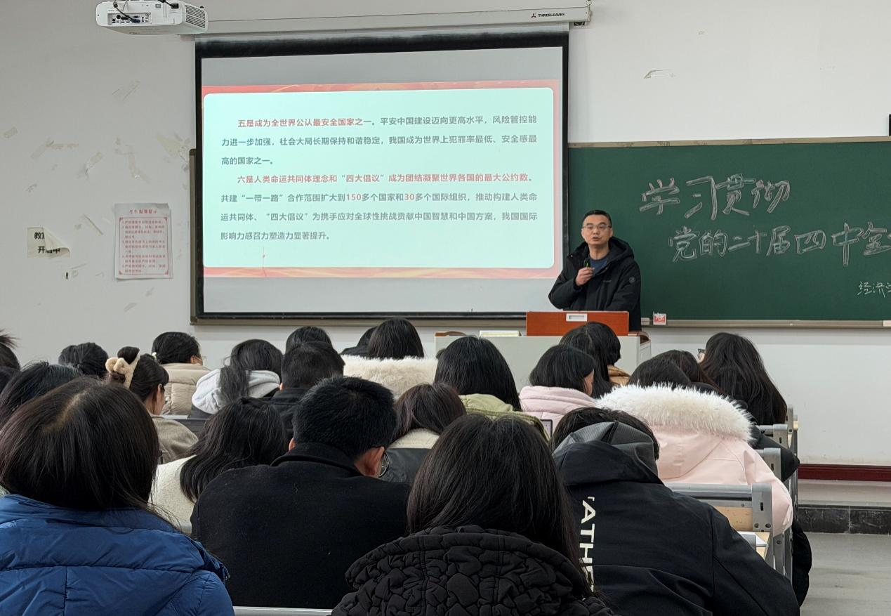 按照市委教育工委统一部署及学校党委工作安排,学校学习贯彻党的二十届四中全会精神宣讲工作持续深入推进。1月6日下午,副校长崔中山在1507教室为经济学院党总支和通识教育学院党总支全体党员及教职工作专题宣讲报告。