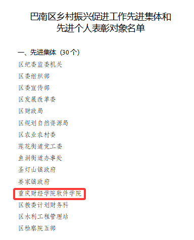 近日,中共重庆市巴南区委、重庆市巴南区人民政府发布表彰决定,授予我校软件学院“巴南区乡村振兴促进工作先进集体”荣誉称号。在此次表彰中,我校软件学院是全区唯一获此殊荣的高校单位,标志着学院在服务地方发展方面取得了突出成就。