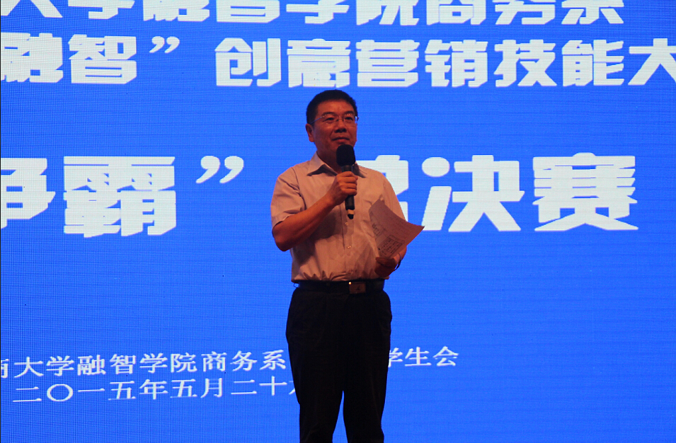 (通讯员 王麒)2015年5月26日晚上7点,商务系举办的“赢在融智”创意营销技能大赛总决赛在学术报告厅正式举办。在过去的两个多月的时间里,该活动得到了学院领导、业界以及各位老师的大力支持。此次比赛邀请到重庆工商大学商务策划学院程宇宁教授、彭建仿教授,重庆国际博览中心常务副总经理、商务系产业教授纪伟,重庆会展行业协会秘书长牟震、重庆市中环盛世商务会展有限公司执行董事高健、重庆奔吃食品有限责任公司总经理谭方、康师傅西南营运中心推广计划孟岩、管理工程系党总支副书记罗婷婷、团委副书记李刚等作为专家评审团。康师傅人力资源发展科主管谢文娟、靠谱的电子游戏官网处处长李春雷、教务处副处长滕学英、商务系副主任张红梅等嘉宾、应邀出席。