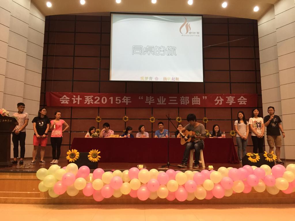 “留学,考研,就业”——这便是毕业的三部曲,为分享会的顺利开展明确了方向。首先,张颖雨、张璐、卢悦和陈雯雯等4位应届毕业生分别从考研积累和侧重点、传递校园情怀、就业定位和规划、出国深造把脉这4个方面进行了经验分享和温馨提示,激发了同学们踏实励行的活力。随后,会计系团学学员和8位嘉宾共同演绎《同桌的你》,彰显了菁菁融智母校美好的记忆,在场老师和同学都深受感动。视线由歌曲演绎切入到了4位往届毕业生的珍贵分享,刘清兵和韦怡重点提到了“能力、证书、实践”对步入社会工作的关键作用,提醒我们在大学校园内通过专业知识的积累、凝练和提升,获取证书自然能够做到水到渠成,而合理利用大学生成长成才互动平台培养组织、协调、沟通、管理、创新能力,在实践中运用基础学科知识实现既定目标便有的放矢。积极参与到公务员序列的任骏学姐和拥有丰富社会实践经验和见闻的黄榆婷也在这次分享会中倾囊相授,从他们的诠释中,我们能够感受到学习在于坚持和励行,要着重把脉时代发展的前沿动态,包括专业方向的前沿资讯和自身兴趣点的热论点,更要在执行力上做好把关,把思维和行动的差距逐步缩小。