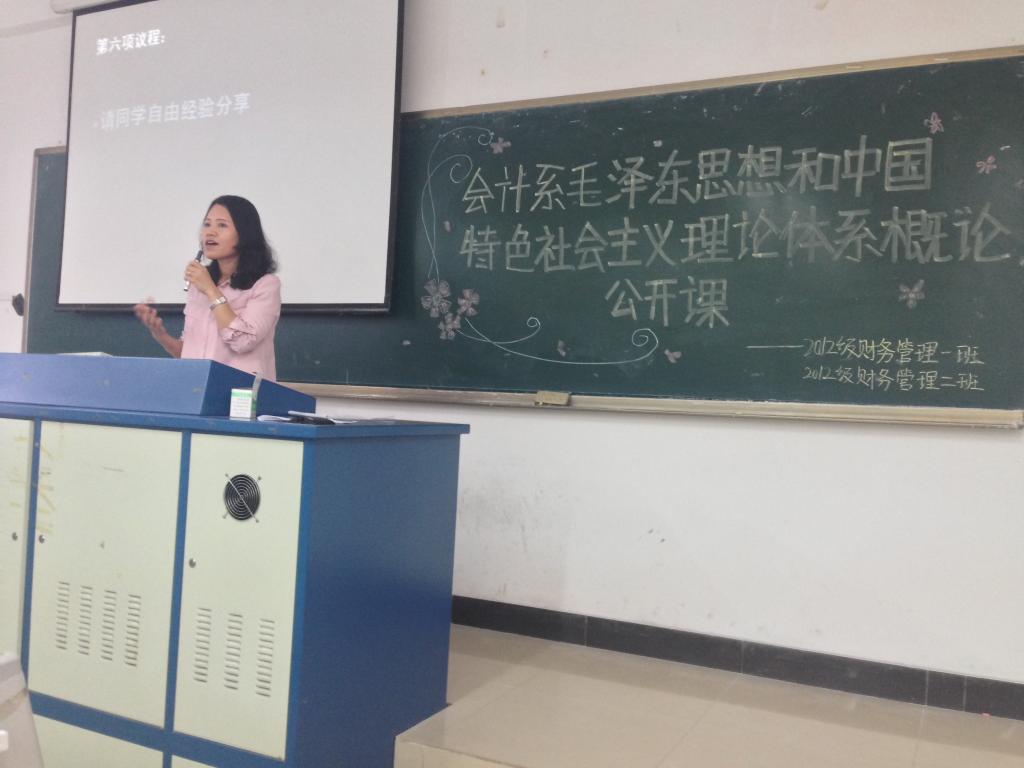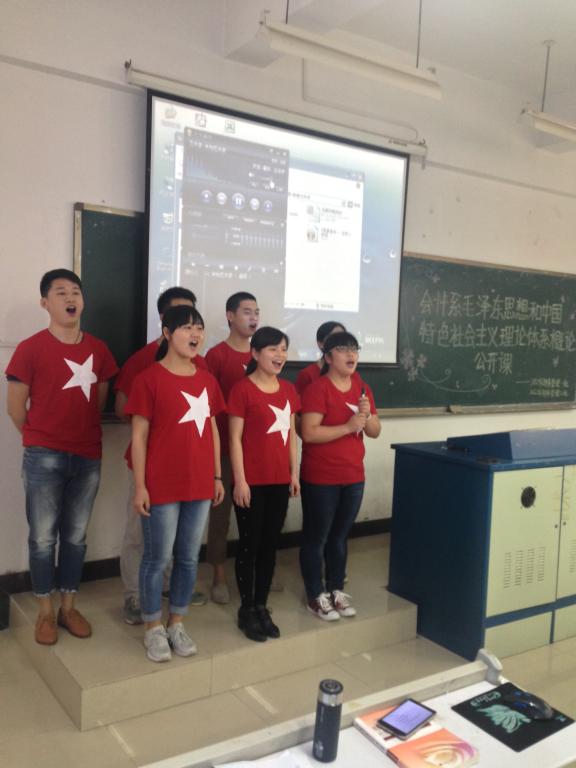(通讯员李静)小品朗诵脱口秀,合唱快板编新曲。2015年5月7日上午,会计系2012级财务管理一、二班在10412教室顺利开展“建设中国特色社会主义总布局”的主题活动。本次活动由“毛中特”实践课指导老师徐丽锦监督、指导,同时,思政部副主任常晓薇、马原教研室主任崔文卿及马原教研室刘心和吴琳老师应邀担任评委。