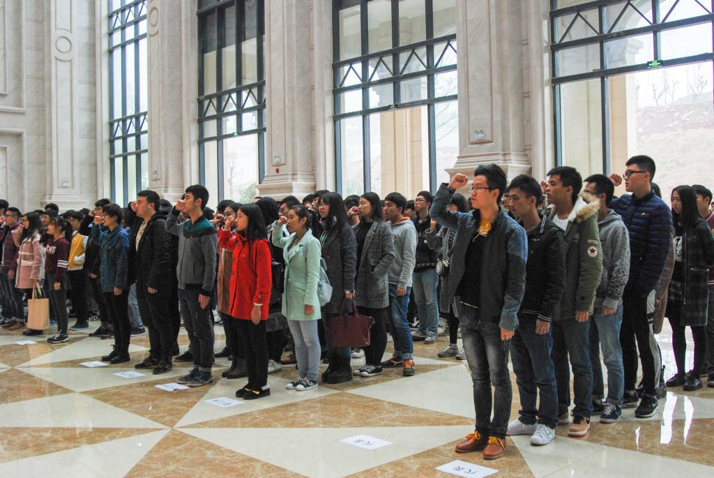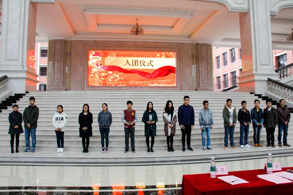 (通讯员 江佩琳)2015年11月26日12:10 ,重庆工商大学融智学院新团员入团仪式在教学楼二楼大厅顺利举行。管理工程系学团办主任王玲艳、信息工程系学团办主任乐晓勇以及团委副书记李刚应邀出席本次大会。