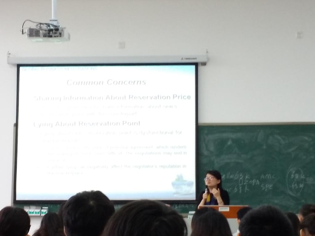 本次公开课为2013级国际商务专业1班、2班的《国际商务谈判》课程,由商务系向丹老师采用双语授课的方式进行讲授。在课堂上,向老师声音洪亮、语调抑扬顿挫、幽默风趣,通过生动有趣的案例与图文并茂的PPT,深入浅出地讲授了《国际商务谈判》中有关商务谈判中的保守价和磋商议价策略。此次授课内容丰富,条理清晰,重点突出,教学效果获得了一致好评。