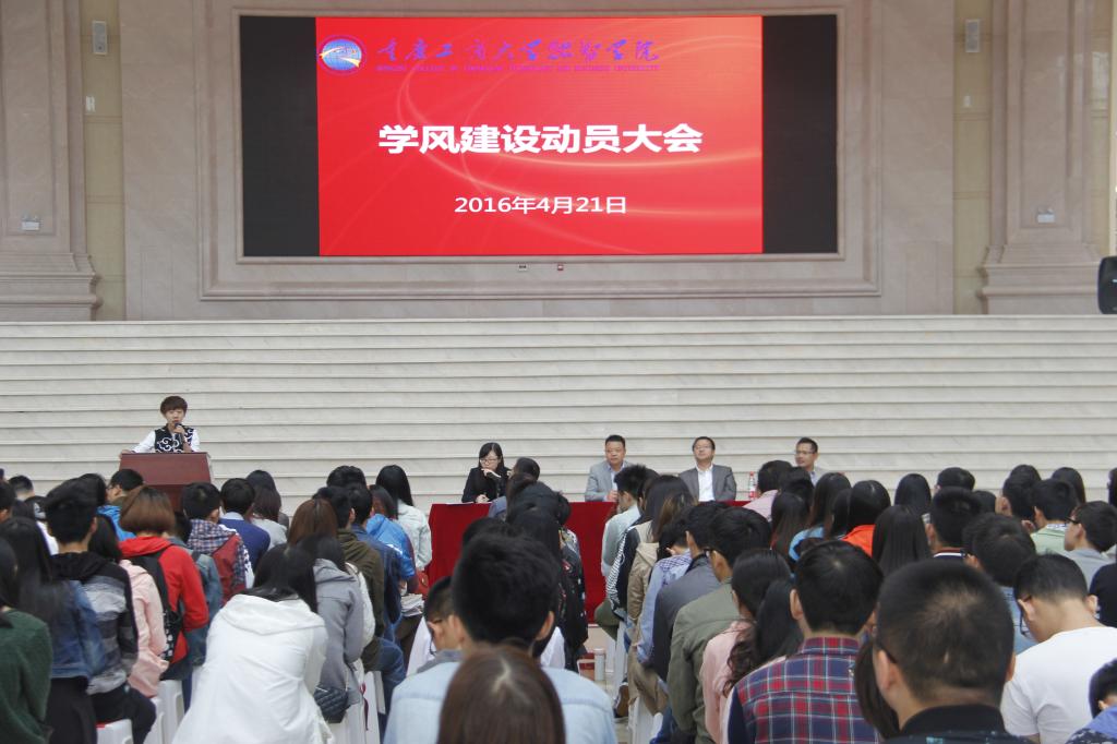 随后,姚转花副处长对《重庆工商大学融智学院学风建设实施方案》作了详细的解读,包括召开学风建设动员大会、开展“读书月”系列活动、开展学生帮扶活动、开展职业生涯规划活动等共十四条工作事项。紧接着由学生代表詹万清发言。他作为学生干部不仅严格要求自己,并号召同学们积极参与学院组织的各项学风建设活动,做到“学风建设,我知晓、我参与、我受益”,这样才能更好地促进我院学风建设工作的开展。之后,辅导员代表陈倩茹老师发言。她通过慷慨激昂的演讲赢得阵阵掌声,她告诉在场的师生,学风建设不是一个人的事,不仅需要教师的引领,辅导员尽心尽力的付出和言传身教,更需要每个学生发挥主动性,成为学风建设的主体,在学习的海洋中找到健康积极向上的自己。