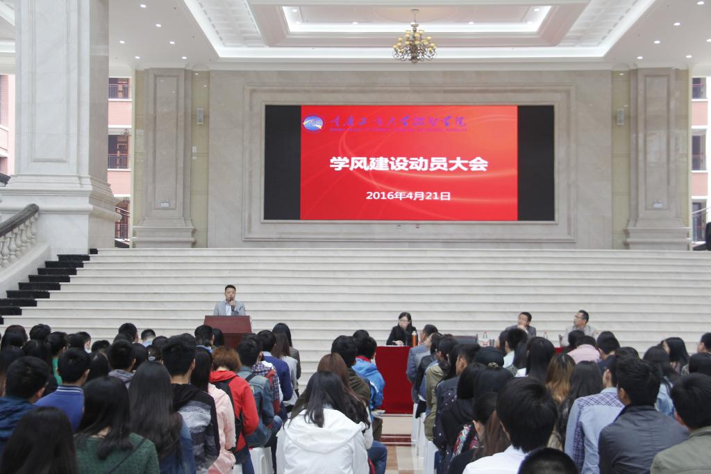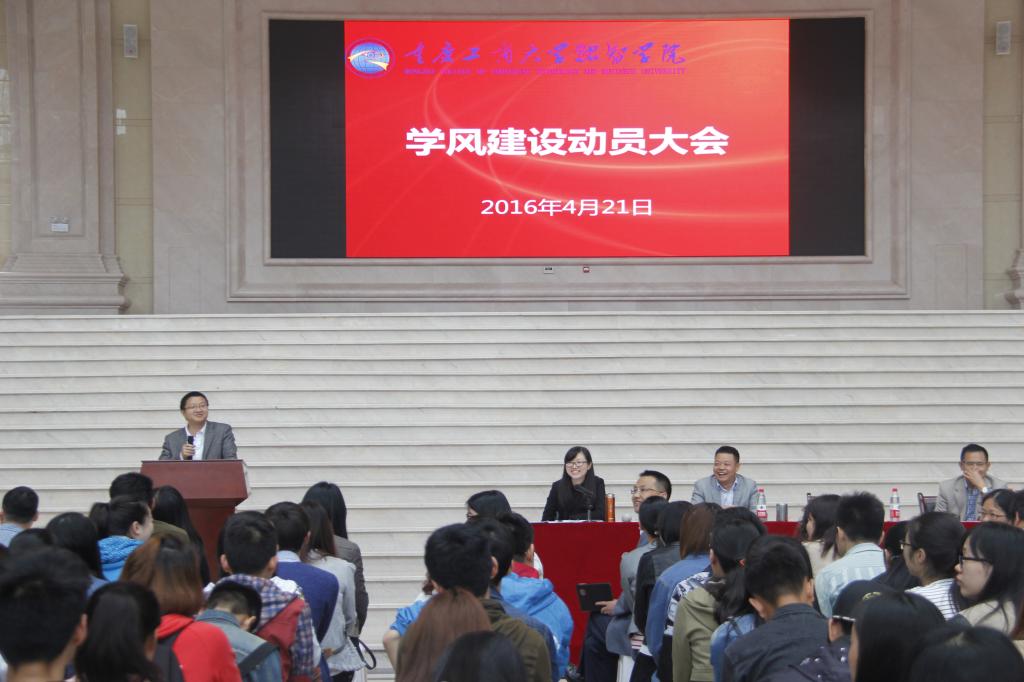 (通讯员 张洪果 唐龙)为切实加强我院学风建设,树立良好的学习风气,激发学生的进取意识,我院于2016年4月21日中午在教学楼二楼大厅顺利召开了学风建设动员大会。学院党委副书记陈龙国、副院长吴华安、院长助理兼学生处处长李果、学生处副处长姚转花、各系党总支副书记、教务处老师代表及各系辅导员出席,各学生组织主席团、各班班长、团支书参加了本次会议。大会由学生处副处长姚转花主持。