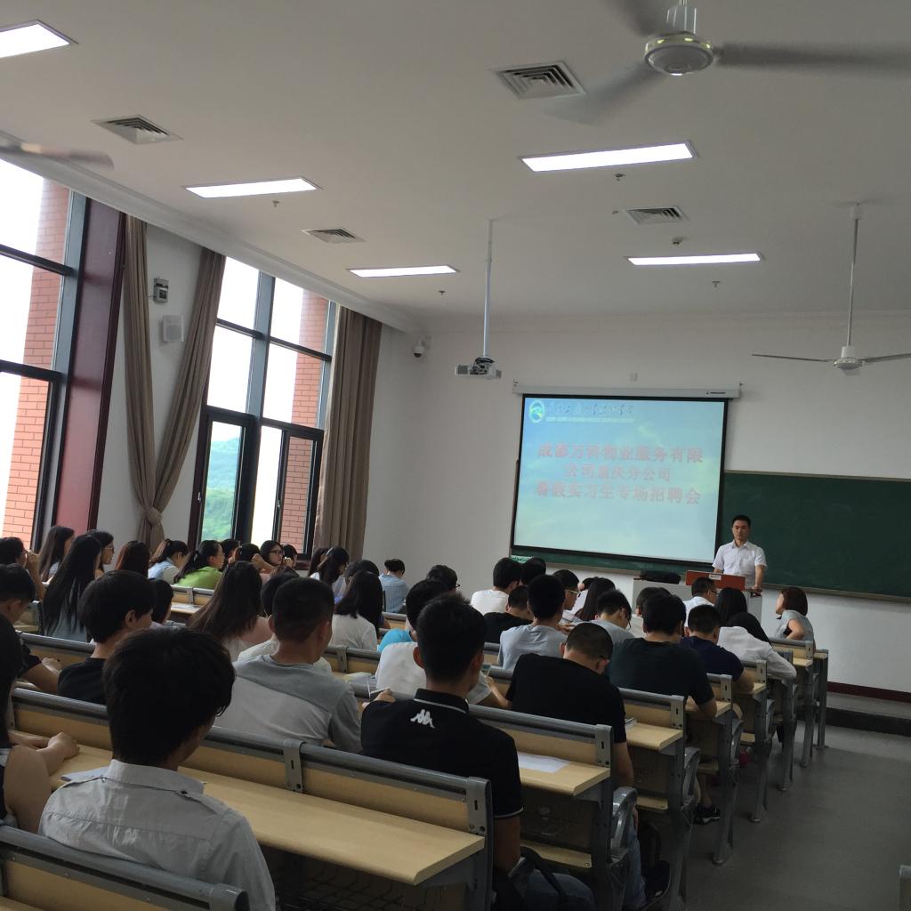 首先姜老师对成都万科物业重庆分公司杨经理一行表示热烈欢迎;随后该公司杨经理介绍了万科物业在中国的物业行业的地位以及目前万科物业服务规模、管理资产、近年营业收入、员工待遇晋升机制等,针对目前物业行业变革,万科物业目前积极变革的情况等;最后公司人员对有意向前往实习的学生进行现场面试,分为初试与复试两轮,招聘会一直持续到中午1点半。