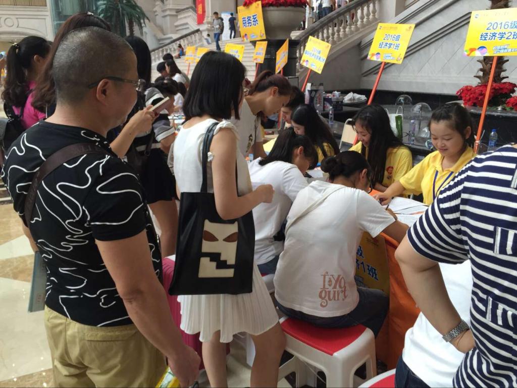(经济学院 冉宇)炎炎烈日,难敌新一届求学的渴望;默默奉献,方显志愿者无私与真诚。2016年9月3日上午7点30,我校经济学院迎新志愿者早早来到教学楼二楼大厅,开始了最为忙碌的迎新工作。一张张热情的笑脸,一句句亲切的问候,一项项贴心的服务,真挚的欢迎着来自四面八方的莘莘学子。