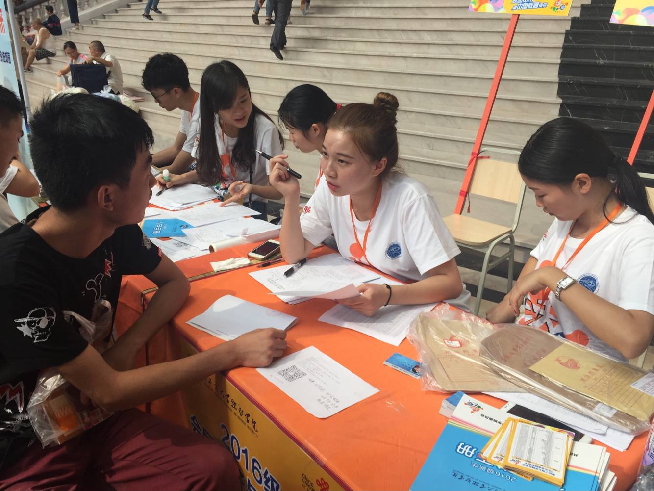 迎新工作如火如荼,到处都是忙碌的身影。商务学院学生会的学长学姐们耐心热情地为新生、家长们解答入学问题登记处的志愿者们在教学楼大厅有序地为新生们办理入学手续,接待组的志愿者们指引新生入住寝室帮忙提行李。新生细声地叫着学长学姐,老生们沿路介绍学院布局。商务学院的学长学姐们的热情周到的服务很快消除了新生们初到新环境的陌生感。