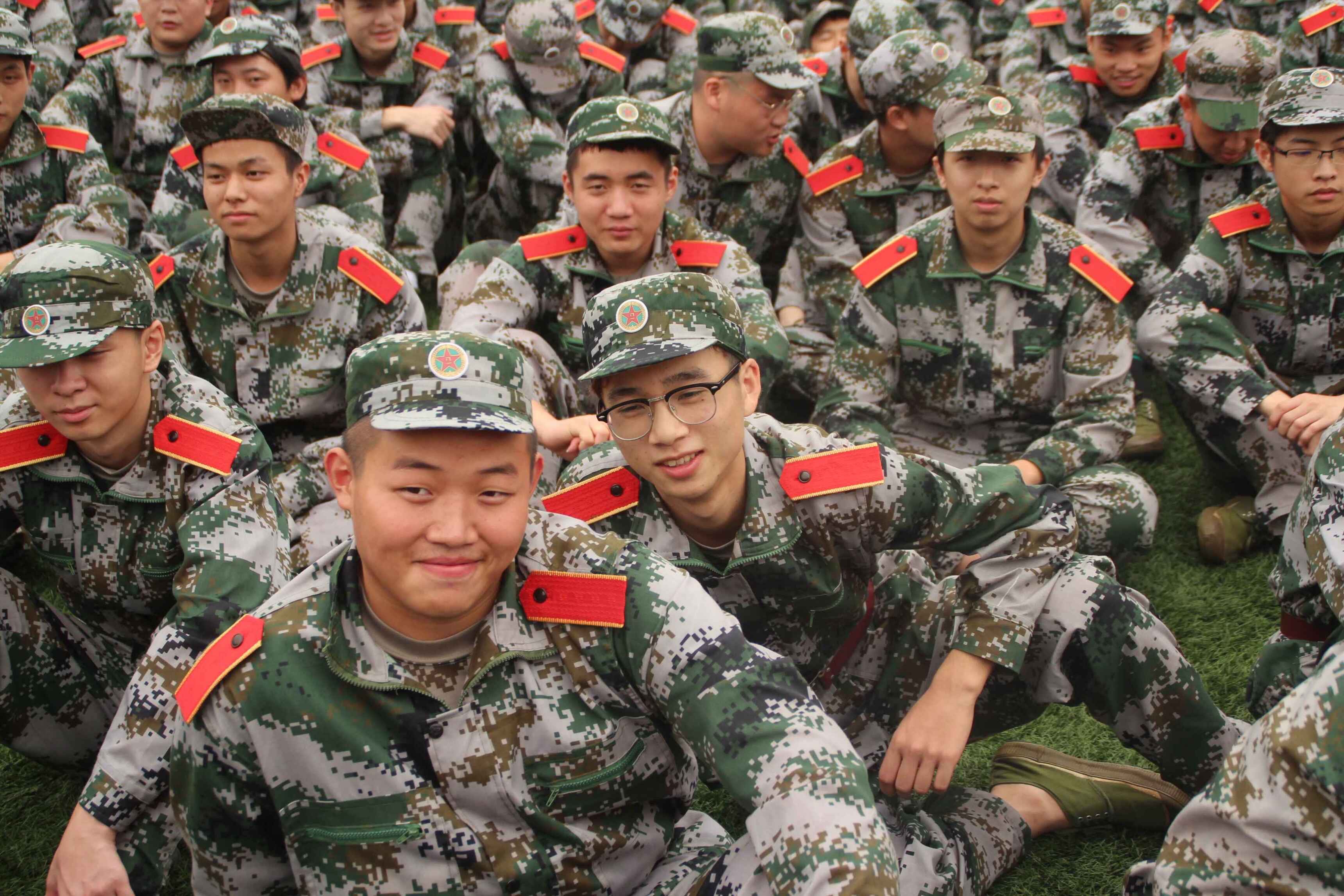 在军训记者团寻找素材的时候,我们意外发现这样几张可爱的面孔:那是干净的脸庞,浓密的眉毛叛逆地稍稍向上扬起,长而微卷的睫毛下,灵动放光的眼眸,显得狂野不拘。英挺的鼻梁,面对我们的镜头咧嘴大笑,此时噙着一丝自由不羁,他们互相搭着肩膀,另一只手比出“v”字,心中的欣喜伴着这一系列动作表现无遗。他们是来自9连经济系网新一班和二班的叶思昱、罗开文、蒋天舟、田祥飞、康建雄、旦彦甫同学。据问询得知,在军训之前他们之前并不认识,就是因为在这次军训中属于相同连队,即使才一起度过两天,就拥有了好比亲兄弟的感情。他们真诚的笑容感染了我们,我们感受到了温暖与愉悦,是的,发自内心的快乐是会传染的,我们不难从他们的眼神中发现,昨日的疲惫已不再,今天的快乐更多了些。