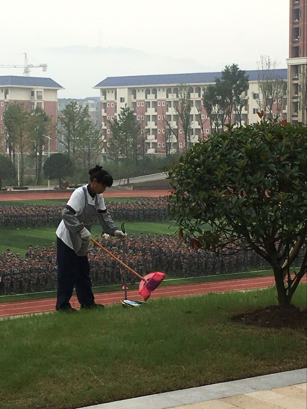 我想起龙应台《大江大海》里他将父母比作城市的行道树,书中写“这些树,种在道路两旁…行道树用脚守着道路,却用脸,朝上接住整个城市的落尘”而在融智学院国防教育训练场上如行道树将尘埃尽吞唯留美好的不止父母,更应有清洁工、校医,这些默默无闻付出着的人,他们好似一场春雨润物却无声,好似一夜秋雨解暑却静默。一句辛苦何尝能明示内心感激,深深鞠躬!