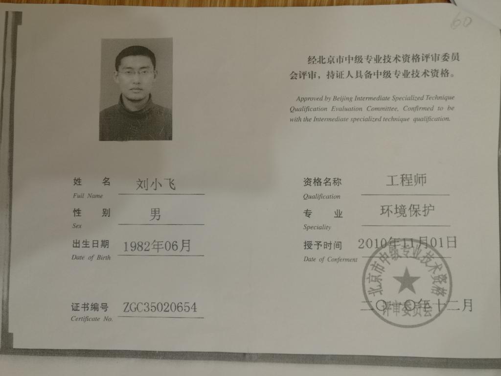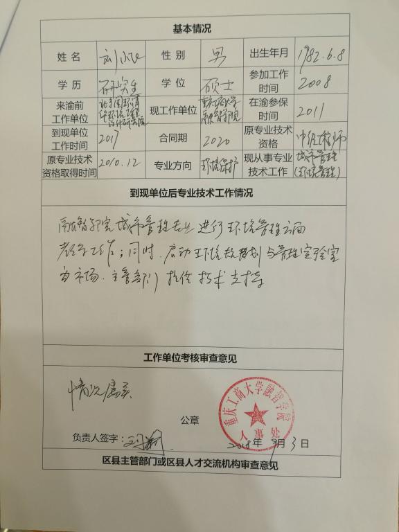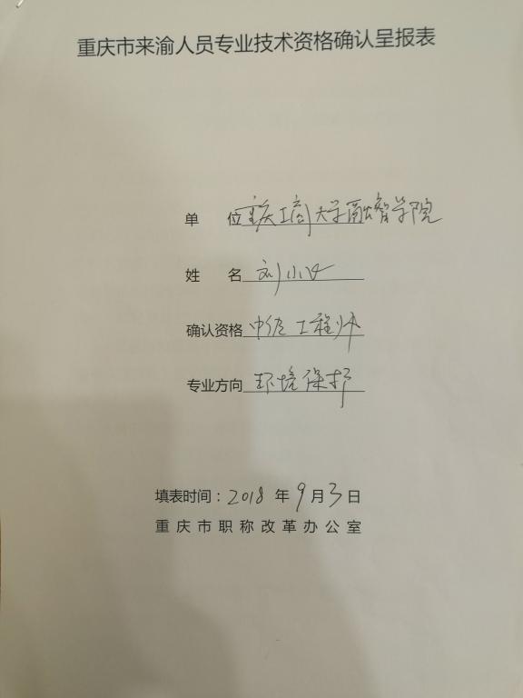 关于我校专职教师刘小飞【重庆市来渝人员专业技术资格确认呈报表】的公示