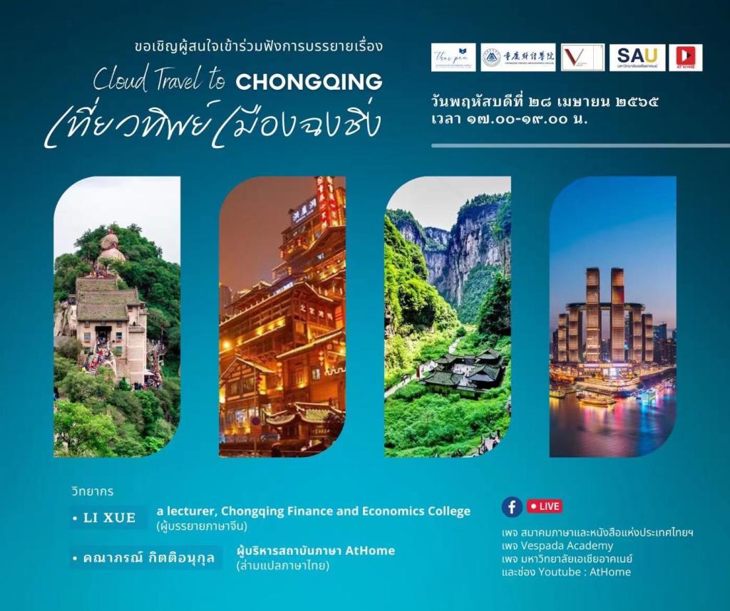 为营造良好的校园国际化氛围,引导我校师生走向世界舞台,讲好中国故事,在教育部中外语言交流合作中心的倡议与指导下,我校友好合作高校泰国东南亚大学的大力支持下,我校将举办首个“国际中文日”活动—重庆旅行日志。该活动将借助泰国皇家赞助的泰国语言和书籍协会平台(P.E.N. International Thailand – Centre Under the Royal Patronage of H.M. The King)、泰国在线教育平台(AtHome),面向全球开放。具体安排如下: