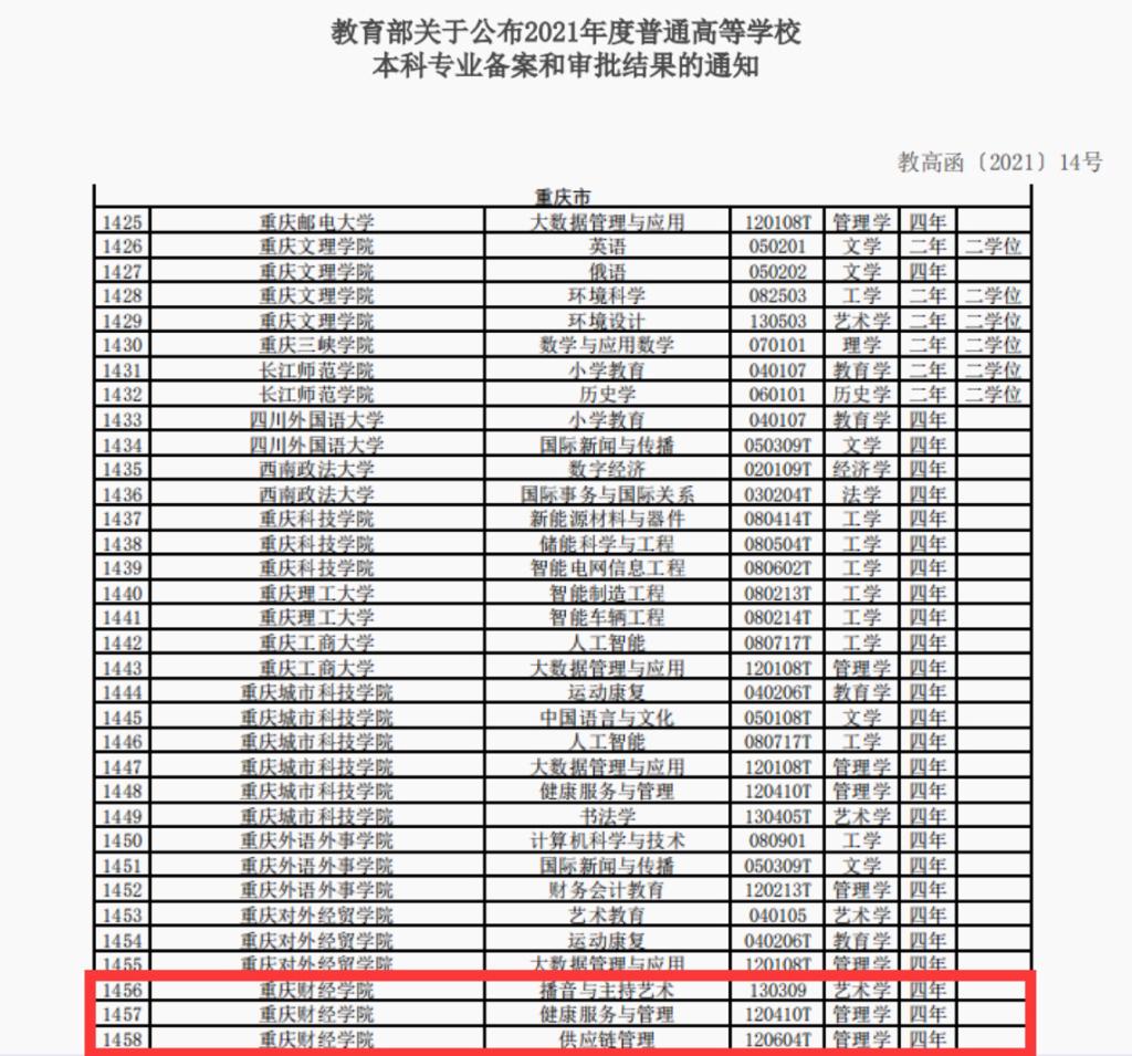近日,教育部下发了《教育部关于公布2021年度普通高等学校本科专业备案和审批结果的通知》(教高函〔202114号 ),我校于2022年新增“播音与主持艺术”、“健康服务与管理”、“供应链管理”三个专业。至此,普通本科专业数共有41个,其中经济学类专业12个,管理类专业19个;工科类专业6个;文学类专业2个;艺术类专业2个。