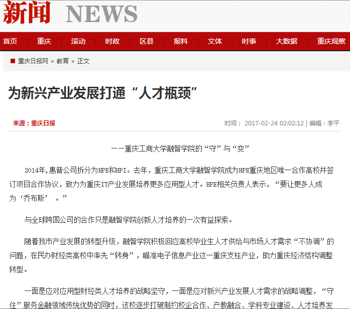 重庆日报2月24日讯(记者 谭茭)2014年,惠普公司拆分为HPE和HPI。去年,重庆工商大学融智学院成为HPE重庆地区唯一合作高校并签订项目合作协议,致力为重庆IT产业发展培养更多应用型人才。HPE相关负责人表示,“要让更多人成为‘乔布斯’ 。”