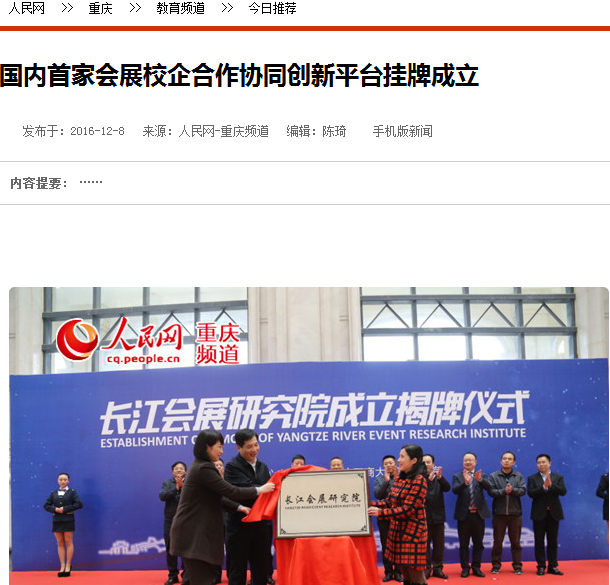 人民网12月8日讯(记者:高缘 谭钰欣)近日,长江会展研究院授牌仪式在重庆工商大学融智学院隆重举行。为全国首家由企业与高校共同组建的会展产学研协作创新平台,长江会展研究院是由重庆国际博览中心有限公司与重庆工商大学融智学院,共同组建的会展专业科研服务咨询机构。